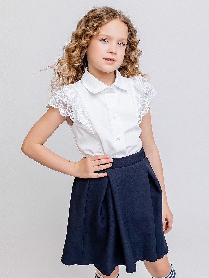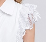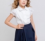 Блузка для девочки белая школьная без рукавов с кружевными оборками. Застежка на петли пуговицы. Размерный ряд изделия - 122-146, что позволяет носить эту необычную оригинальную блузку девочкам от 7 до 11 лет.