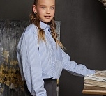 Стильная голубая рубашка в полоску с дизайнерскими подрезами. Эффектный принт в голубую полоску с креативными подрезами в разных направлениях — игра линий добавляет образу динамики и современности. Удобный нагрудный карман слева, классический воротник и застежка на пуговицы — лаконично и универсально. Длинные рукава с аккуратным манжетом для элегантной посадки. Удобная кокетка на спинке обеспечивает комфорт и свободу движений. Идеально сочетается с джинсами, брюками чинос или шортами. Подойдет для школьного, кэжуал- или уличного стиля.