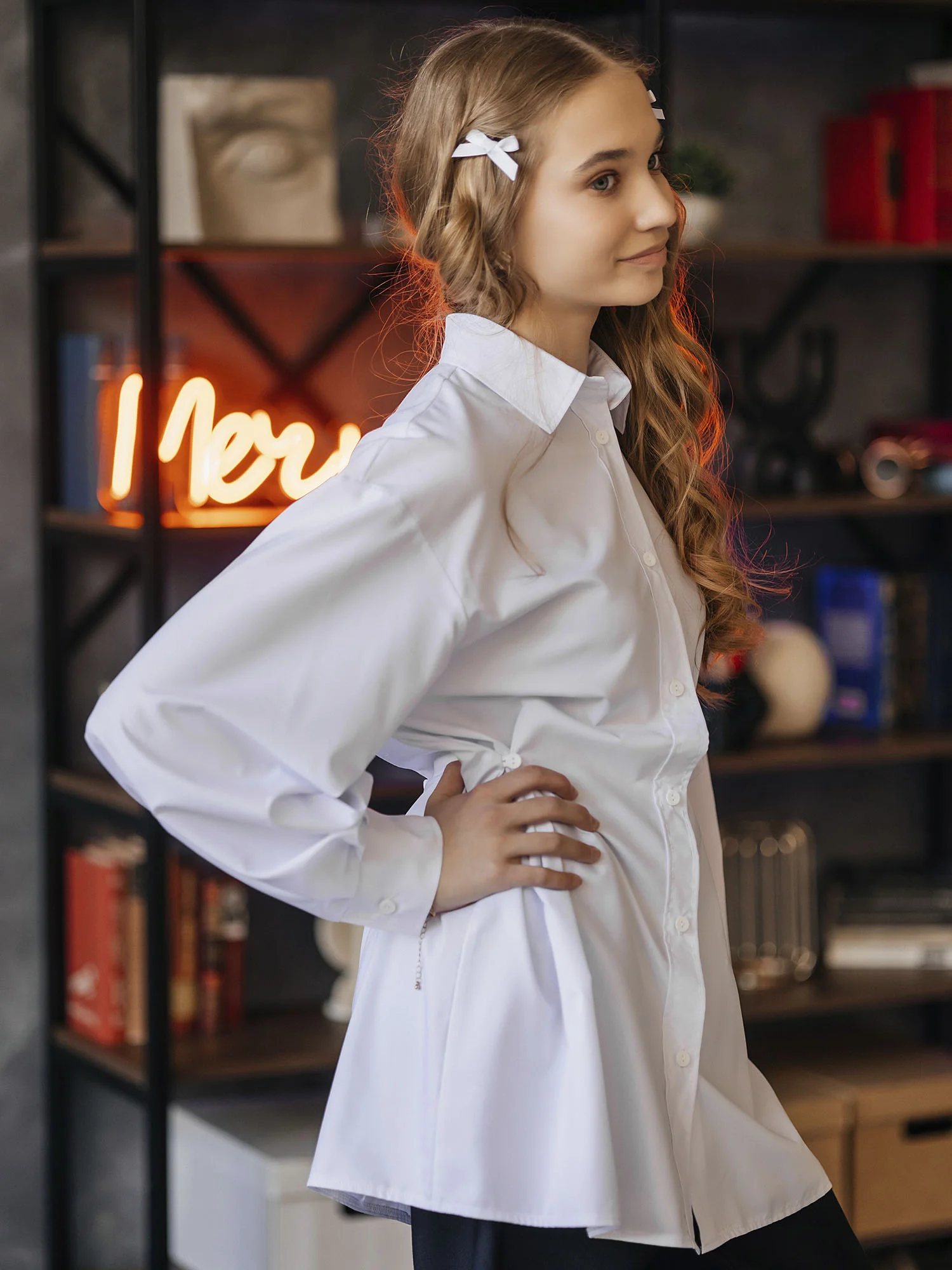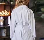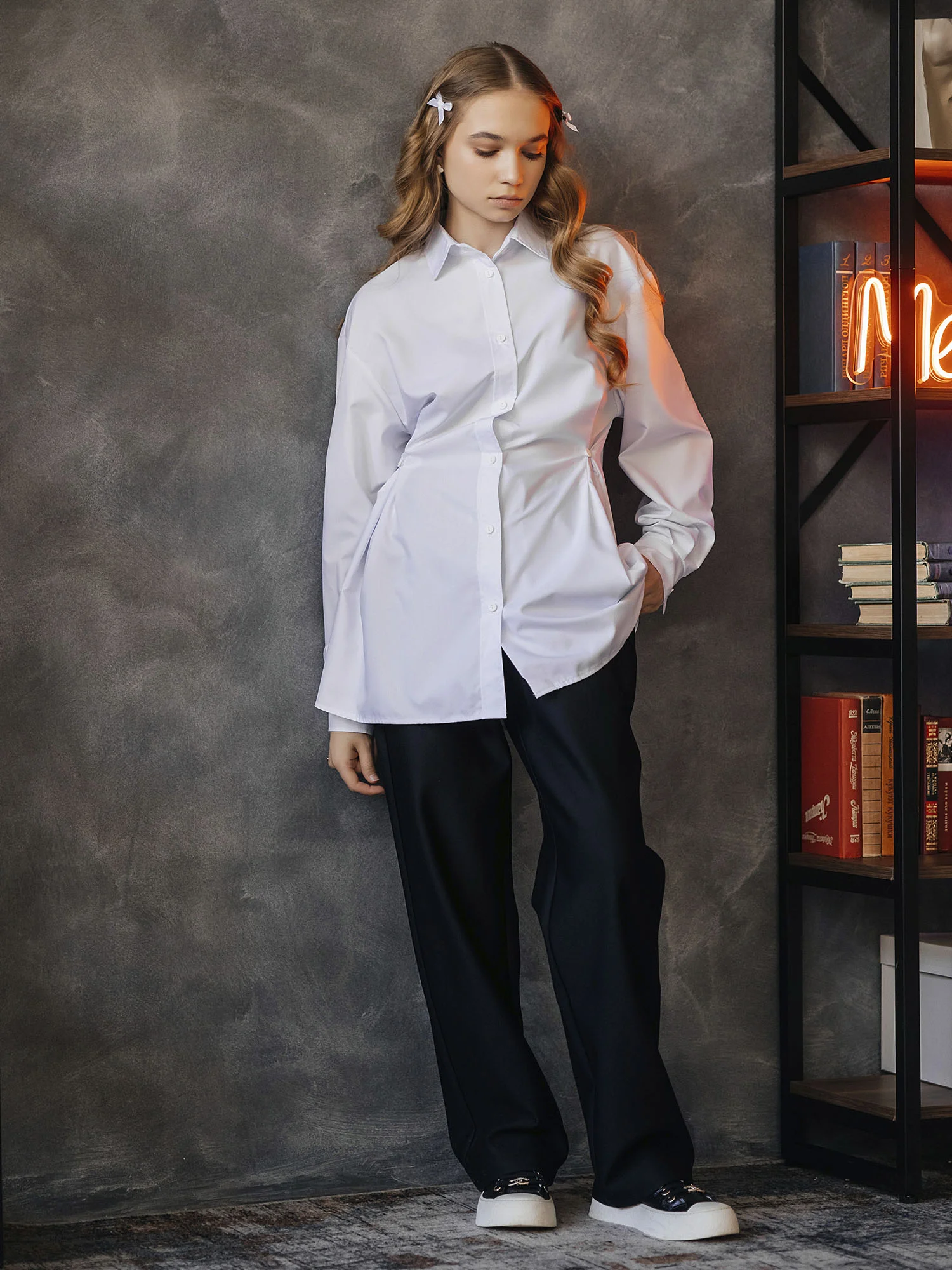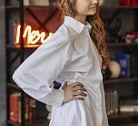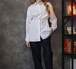 Приталенная рубашка со складками на талии. Застёжка на пуговицы, аккуратный и женственный силуэт.
