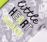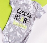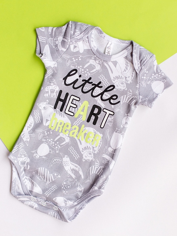 Боди с коротким рукавом для новорожденных серый с принтом и надписью на груди. Горловина-конверт, низ на кнопках.