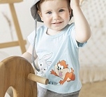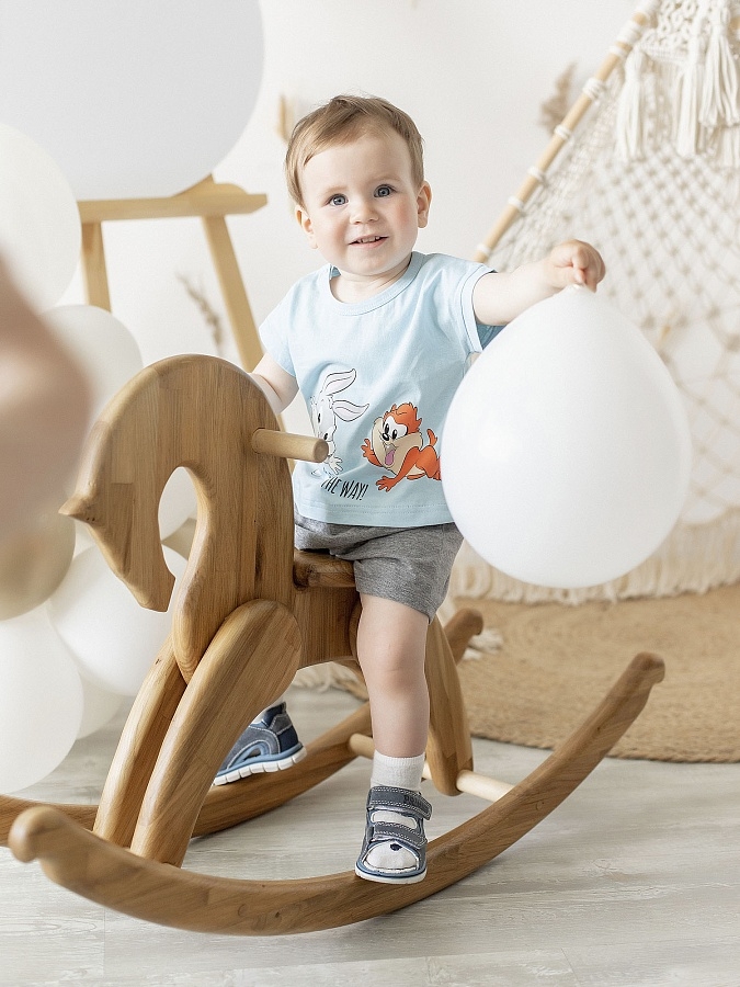 Комбинезон детский трикотажный для мальчика до 1,5 лет. Имитирует футболку и шорты.