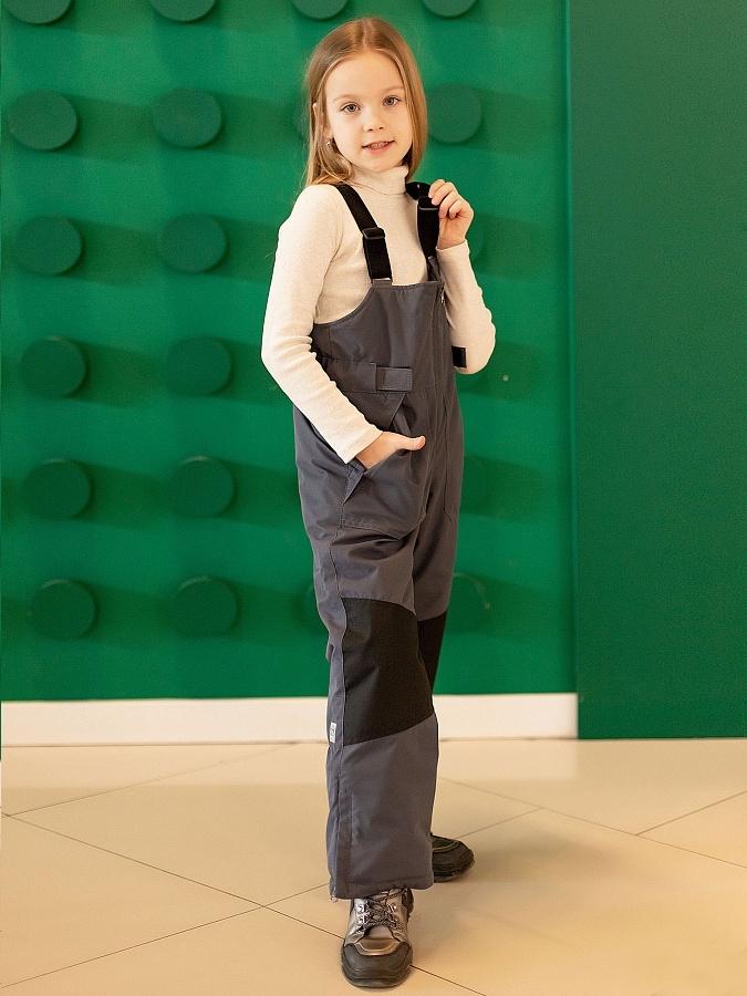 Полукомбинезон Скай детский зимний с регулировкой патами по талии, накладными карманами с клапанами, усилением колен а боковых швах по низу молнии. Цвет графит.