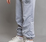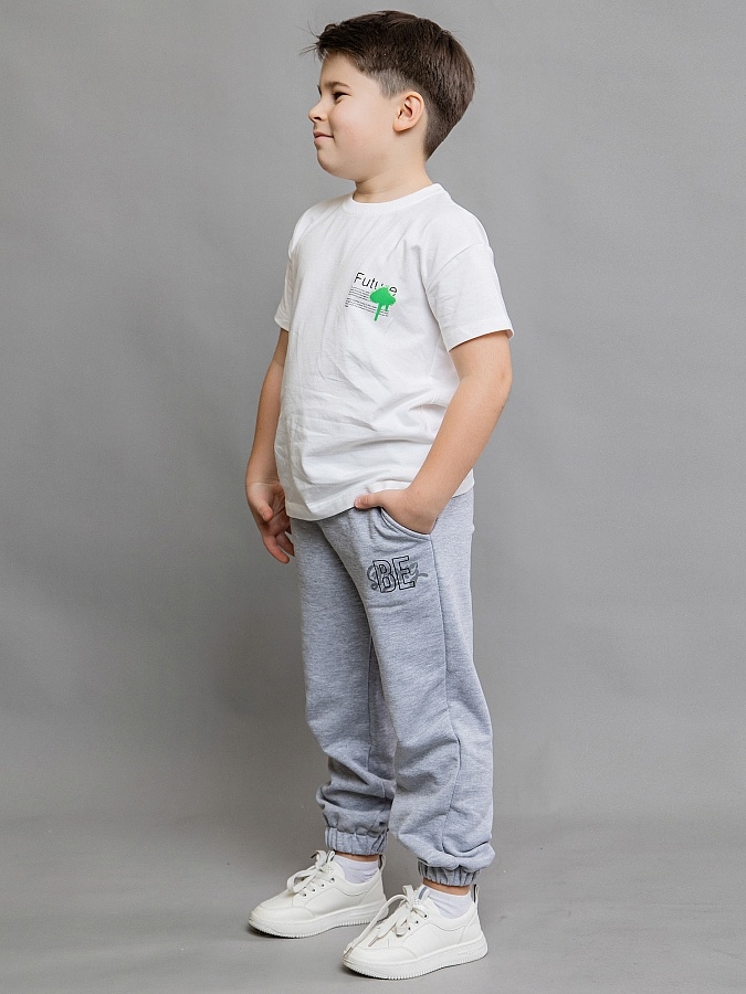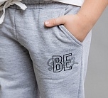 Брюки для мальчика серые из футера спортивные. Базовая однотонная модель для спорта и активного отдыха с карманами по бокам и шнурком в поясе. Свободная посадка, низ брючин на резинке.