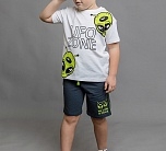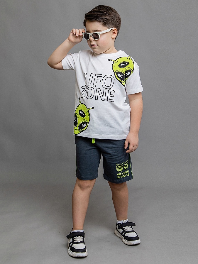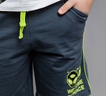 Шорты для мальчика в цвете графит из футера однотонные. Трикотажные шорты яркой расцветки станут отличным дополнением к физкультурной форме. Мягкий хлопковый трикотаж. Свободный крой, средняя посадка, эластичный пояс с кулиской. Рисунок с инопланетянами и надписью.