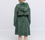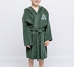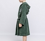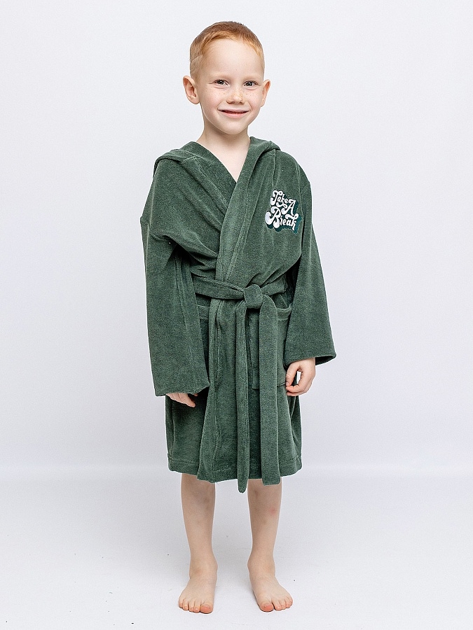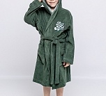 Халат махровый зеленый с капюшоном и поясом для мальчика от batik. С одной стороны вышивка в виде надписи. Халат отлично впитывает влагу, подходит для использования в бане, сауне, бассейне и как домашний халат для дома и дачи. Не линяет и не теряет свой цвет даже после многочисленных стирок.