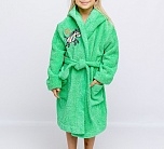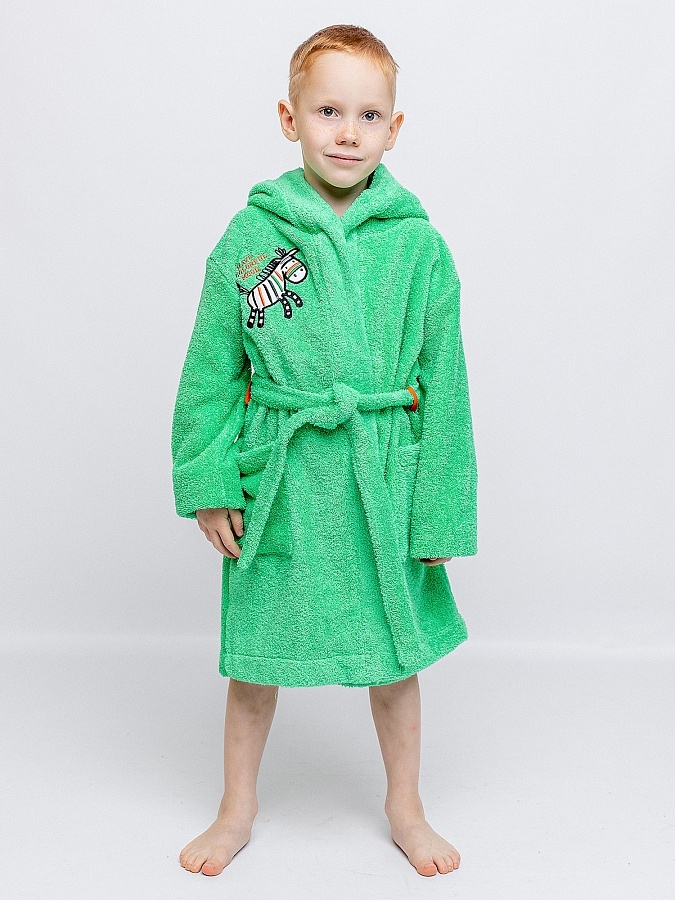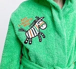 Халат махровый зеленый для мальчика batik с нашивкой в виде зебры и надписью с одной стороны. Мягкий халатик с капюшоном. Благодаря двусторонней махре с длинным ворсом легко впитывает влагу. Два кармана и поясок делают халат очень удобным для ребенка. Оптимальная длина полы и рукавов.