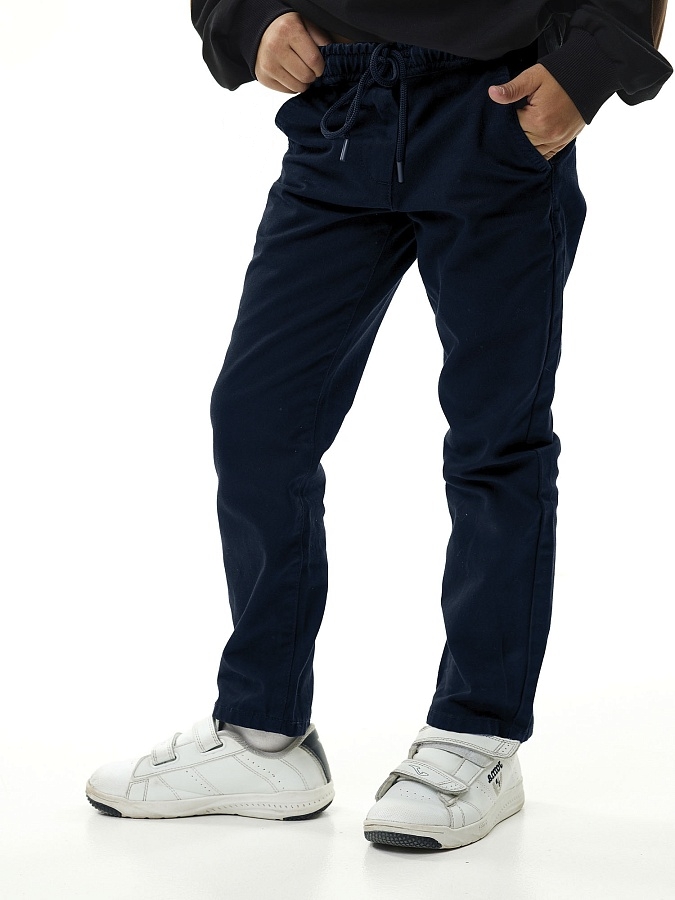 Прямые брюки чиносы свободного кроя, слегка зауженные книзу, из плотной хлопковой ткани с содержанием эластана. Классическая средняя посадка по талии, широкий эластичный пояс-резинка на завязках.Два боковых кармана в шве, два задних прорезных кармана. Суперудобные классические брюки с поясом на завязках для модных образов в школу, на праздник или просто на каждый день.
