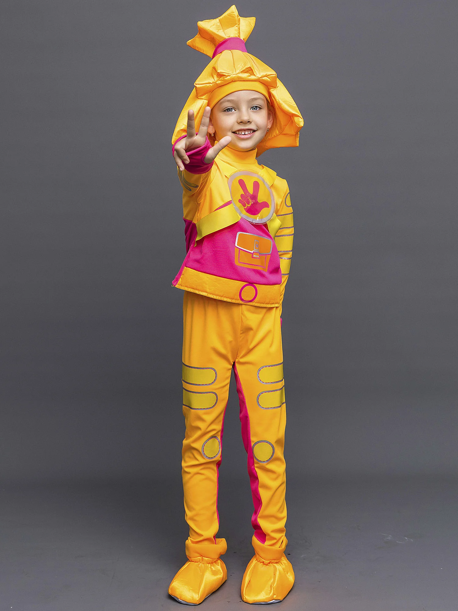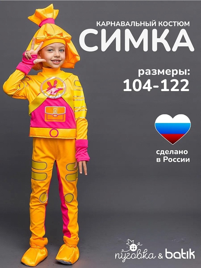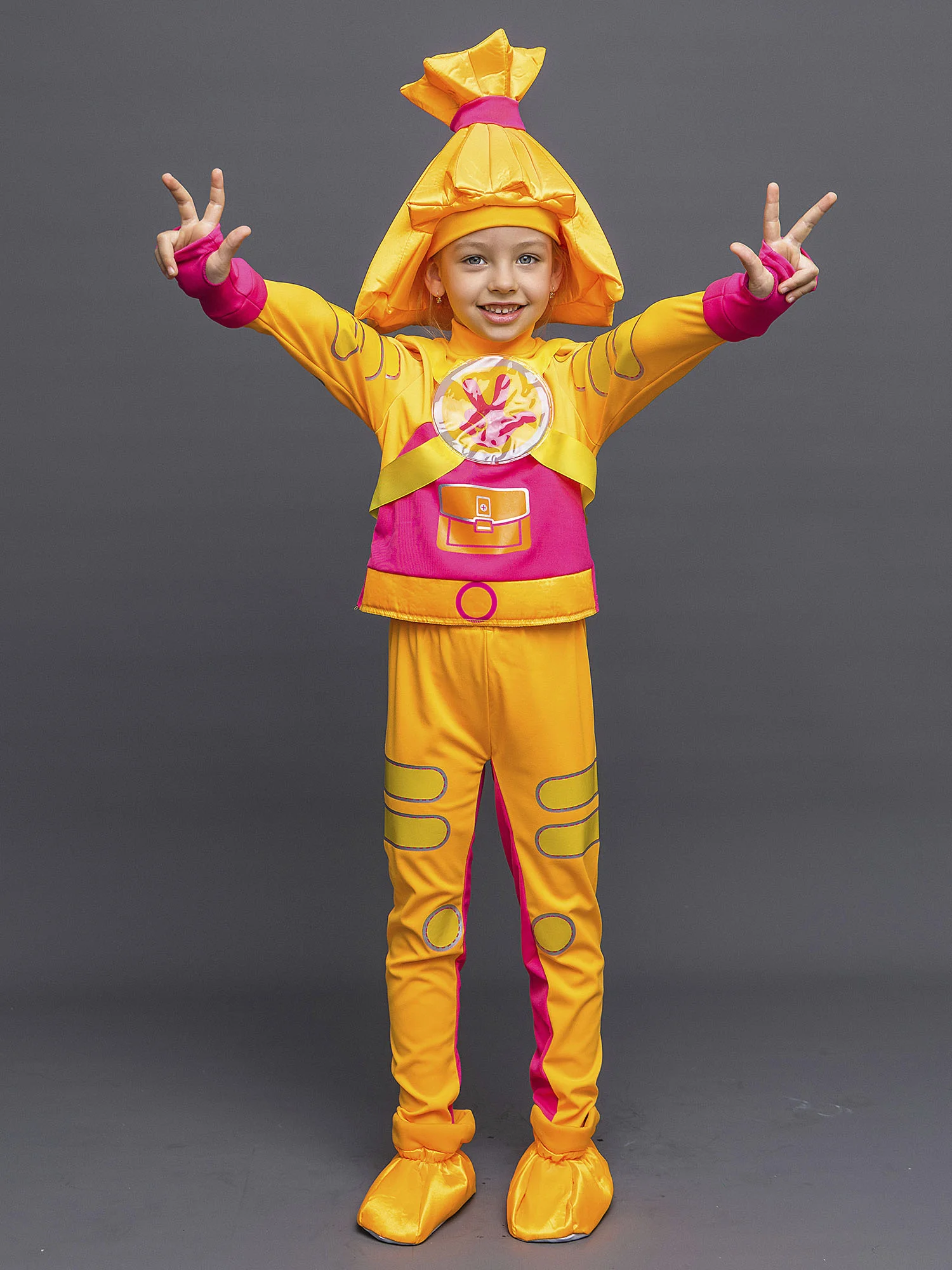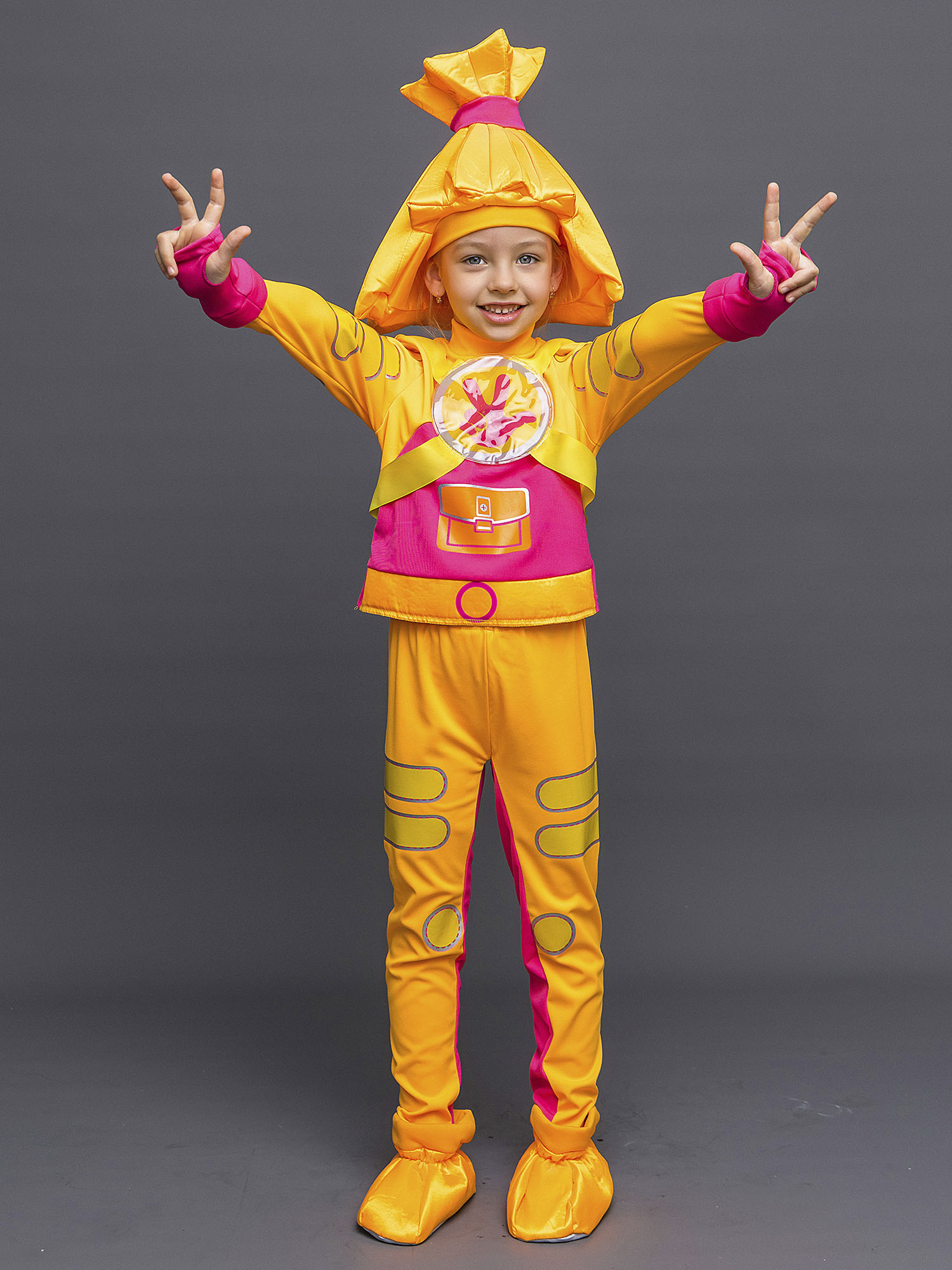 Карнавальный костюм Симки из семейства знаменитых Фиксиков понравится любой девочке, симпатизирующей этому мультсериалу. Симка является главной героиней мультика, отличается умом и решительным характером. Костюм Симки выполнен в ярко-оранжевой расцветке. В комплект входит куртка, брюки, ботинки и шапка.
