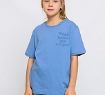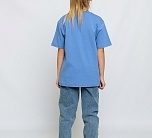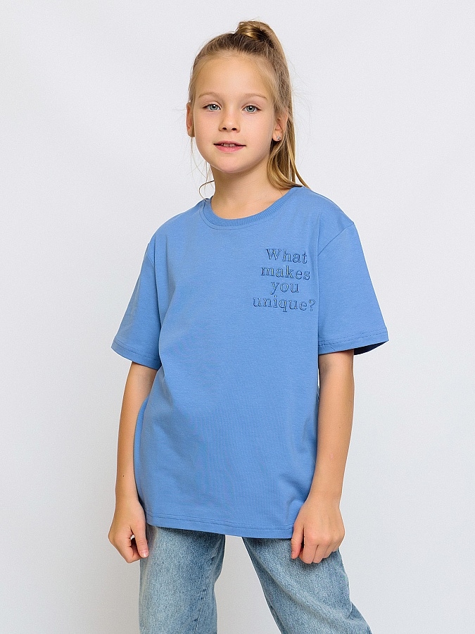 Футболка для детей голубая с коротким рукавом из супрема. Прямая широкая трикотажная футболка изготовлена по всем стандартам безопасности детской одежды, материал не вызывает аллергии, а тело ребенка всегда дышит. Идеально подходит для лета. С одной стороны стильная вышивка в виде надписи.