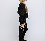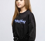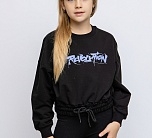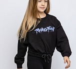 Свитшот (пуловер) черный укороченный на резинке. Спущенный рукав, круглая горловина и широкие манжеты рукавов. На груди принт в виде надписи. Мягкая и теплая ткань футер на основе высококачественного хлопка обеспечит долгую службу изделию и сохранит его первозданный вид даже после многочисленных стирок.