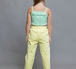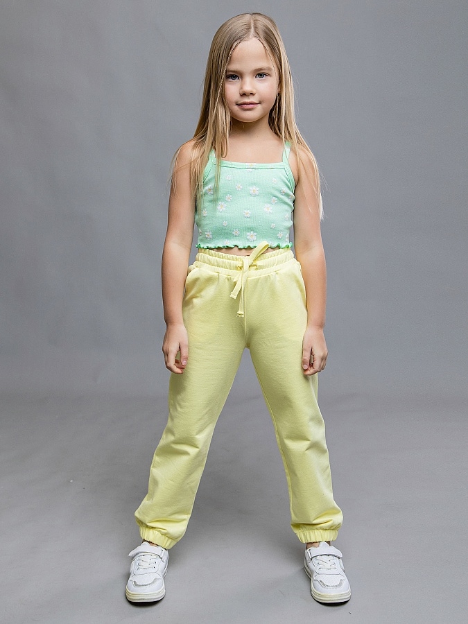 Топ (майка) для девочки зеленая из кашкорсе с принтом в виде ромашек. Кроп-топ в рубчик изготовлен из натуральной ткани (кашкорсе) с добавлением эластана для лучшего прилегания к телу (95% хлопок, 5% эластан), из-за чего хорошо держит свою первичную форму и имеет высокую эластичность. Базовый повседневный вариант в жаркую погоду.