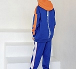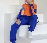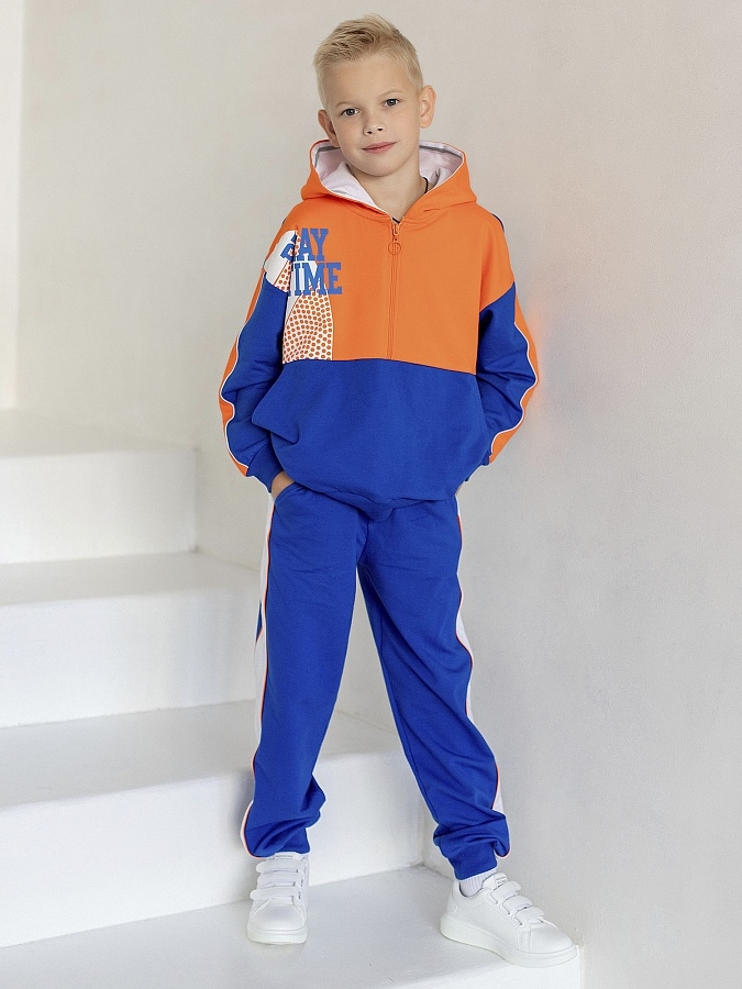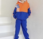 Анорак для мальчика с длинным рукавом из футера. Капюшон, застежка-молния, боковые карманы. Расцветка сине-оранжевая, принт.