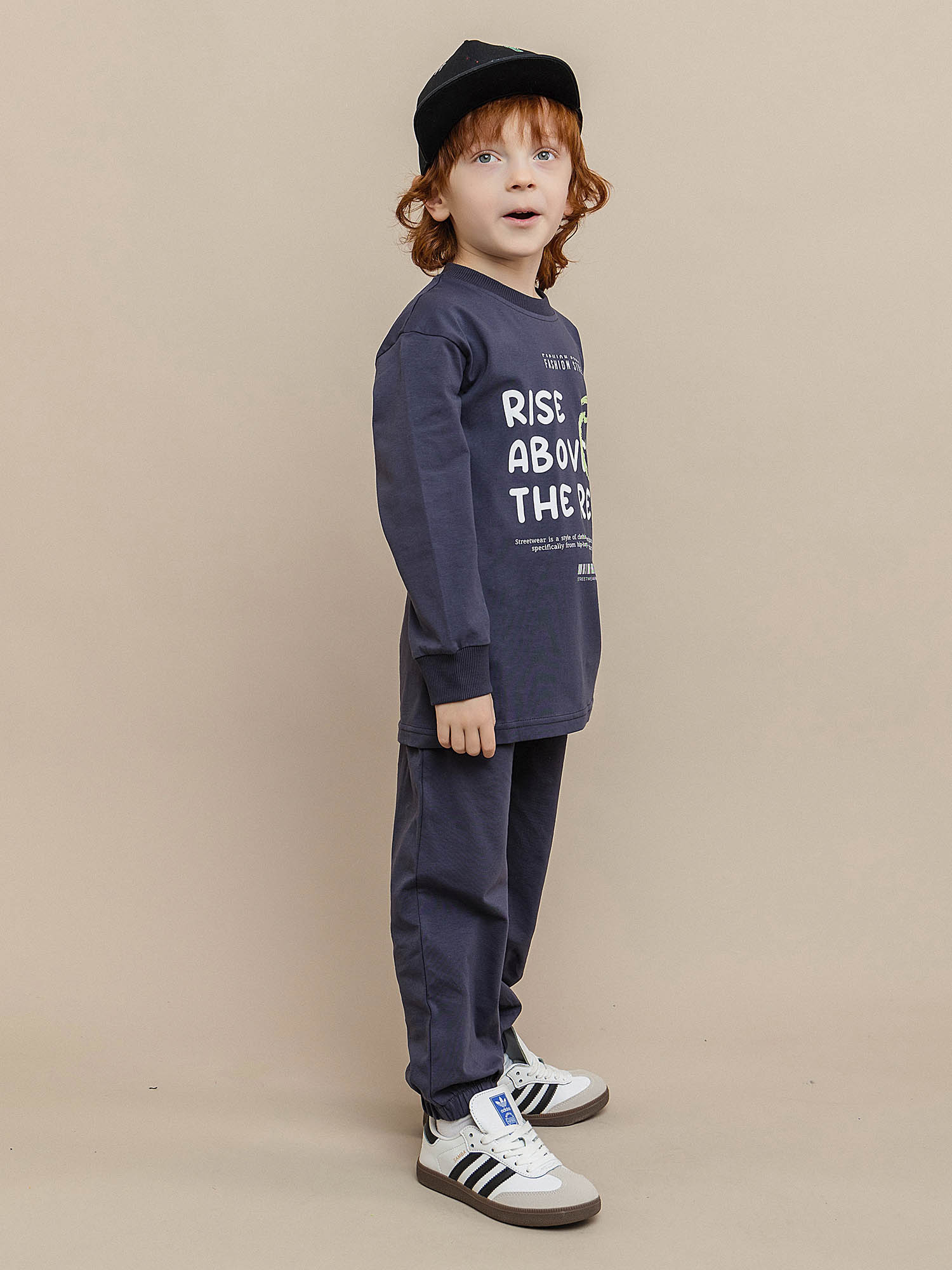 Лонгслив с длинным рукавом для мальчика в темной расцветке. Стильная и комфортная модель для активных детей и подростков выполнена из высококачественного материала, обеспечивающего максимальную мягкость и комфорт при носке. Принт в виде надписей.