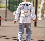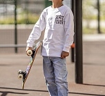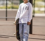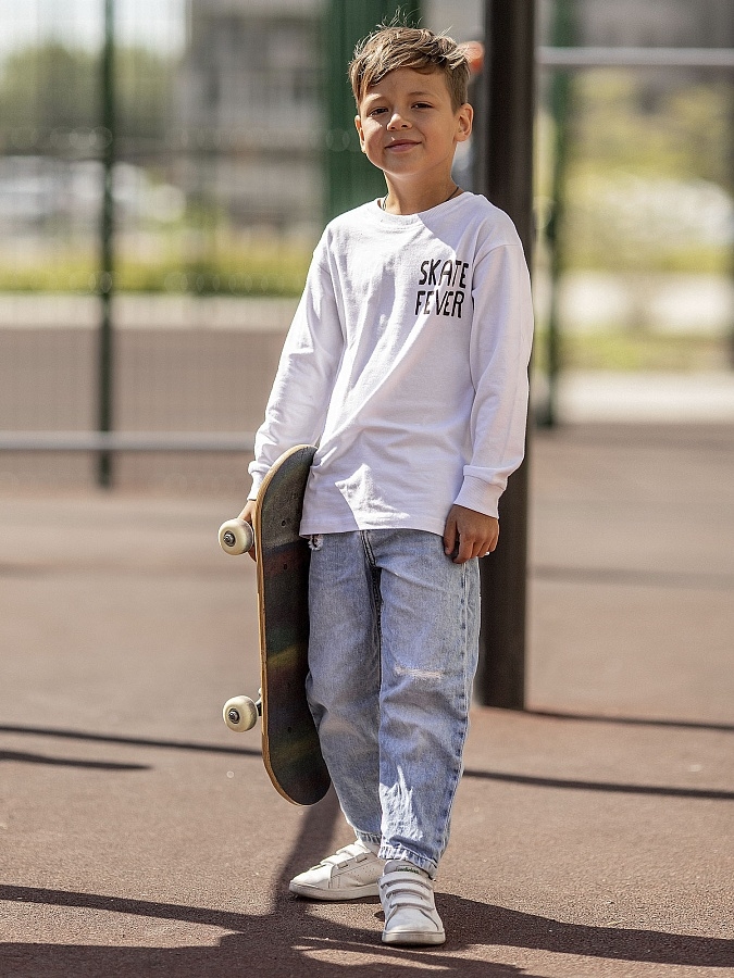 Лонгслив для мальчика белый с длинным рукавом и надписью на груди.