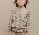 Свитшот для мальчика бежевый свободного кроя из трикотажного полотна супрем пенье. Рукава со спущенной линией плеча и эластичными манжетами. Горловина округлая из эластичного трикотажа. Принт в виде динозавров по всему изделию.