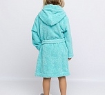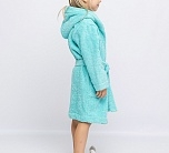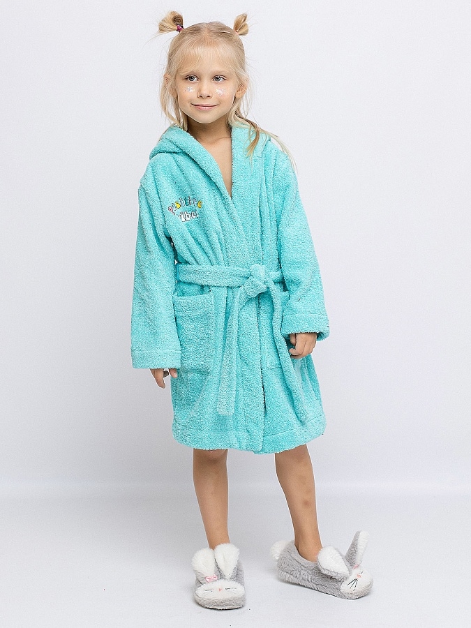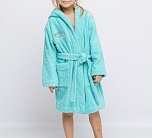 Халат махровый для девочки мятного цвета с нашивкой на груди. Большой капюшон, глубокие карманы и удобный пояс. Детский халат сшит из двухсторонней, хорошо впитывающей влагу, приятной махры. Мягкий и комфортный халатик на каждый день. Халат фиксируется на пояс, который вставлен в петельки по бокам. Халат идеально подходит для детей, любящих купаться, а также для носки в бассейн и другие спортивные секции, где есть душевая.
