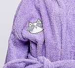 Халат махровый для девочки сиреневого цвета с нашивкой на груди. Большой капюшон, глубокие карманы и удобный пояс. Детский халат сшит из двухсторонней, хорошо впитывающей влагу, приятной махры. Мягкая нежная воздушная ткань, с небольшим ворсом, комфортная для кожи ребенка. Халат фиксируется на пояс, который вставлен в петельки по бокам. Халат идеально подходит для детей, любящих купаться, а также для носки в бассейн и другие спортивные секции, где есть душевая.