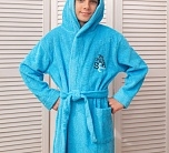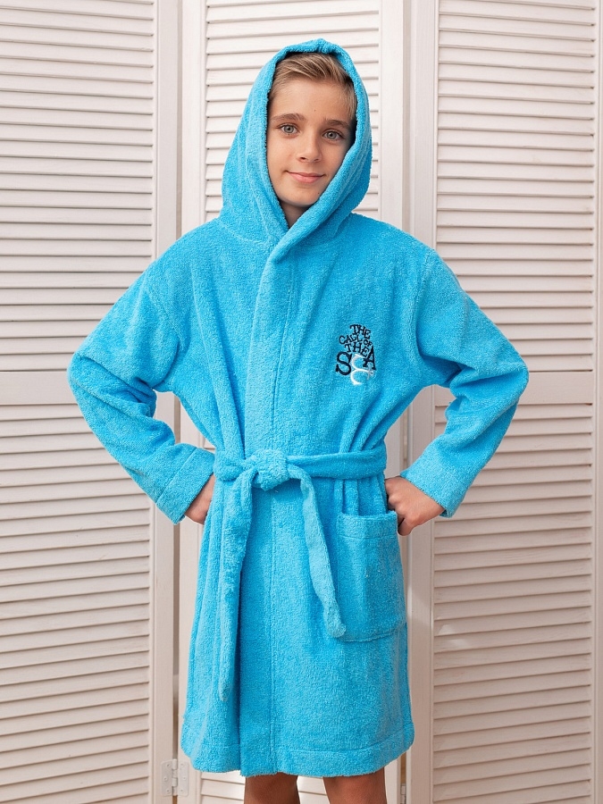 Халат для дома банный в бирюзовой расцветке для мальчиков. Яркий и красивый халат из двухсторонней махры с нашивкой на груди.
