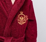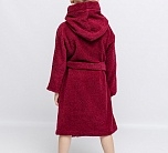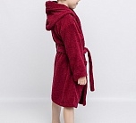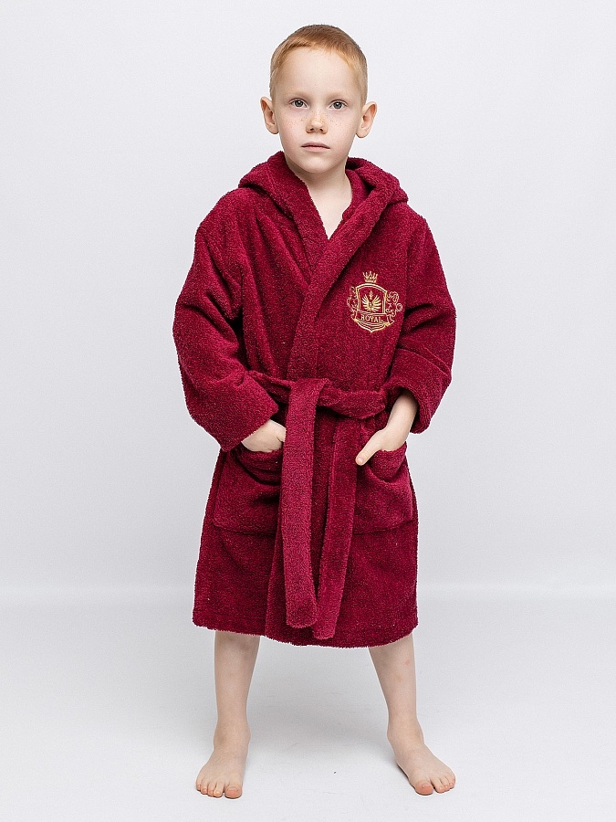 Халат махровый для мальчика бордового цвета с нашивкой на груди. Большой капюшон, глубокие карманы и удобный пояс. Детский халат сшит из двухсторонней, хорошо впитывающей влагу, приятной махры. Мягкий и комфортный халатик на каждый день. Халат фиксируется на пояс, который вставлен в петельки по бокам. Халат идеально подходит для детей, любящих купаться, а также для носки в бассейн и другие спортивные секции, где есть душевая.