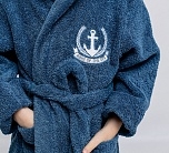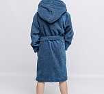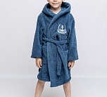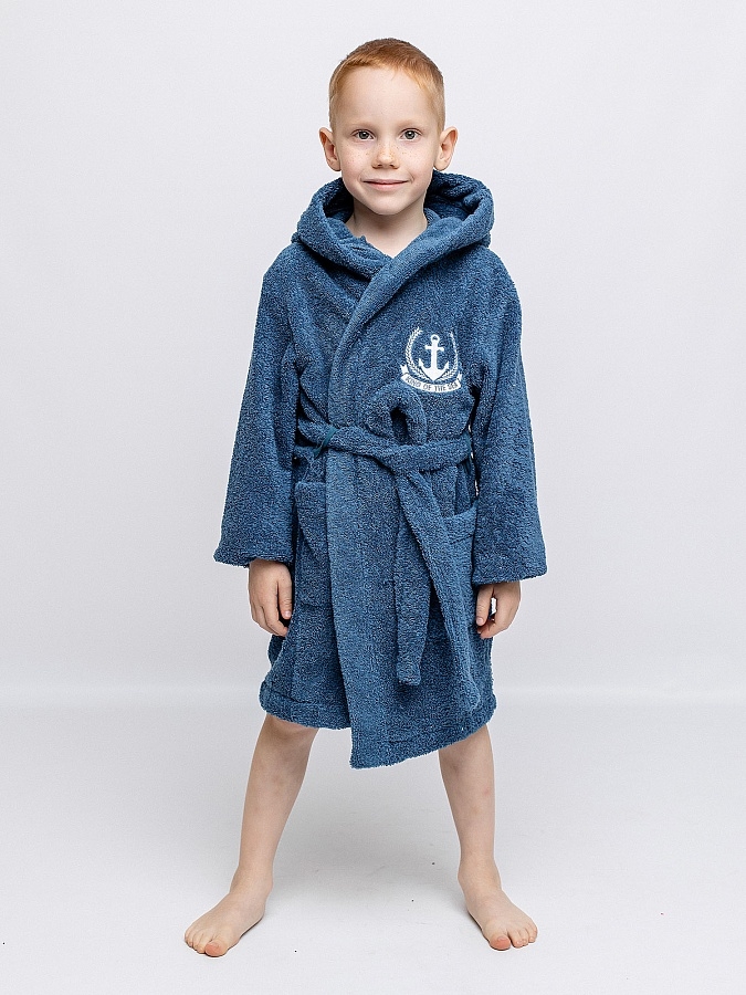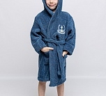 Халат махровый для мальчика цвета индиго с нашивкой на груди. Большой капюшон, глубокие карманы и удобный пояс. Детский халат сшит из двухсторонней, хорошо впитывающей влагу, приятной махры. Мягкий и комфортный халатик на каждый день.