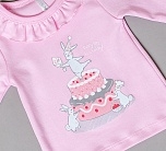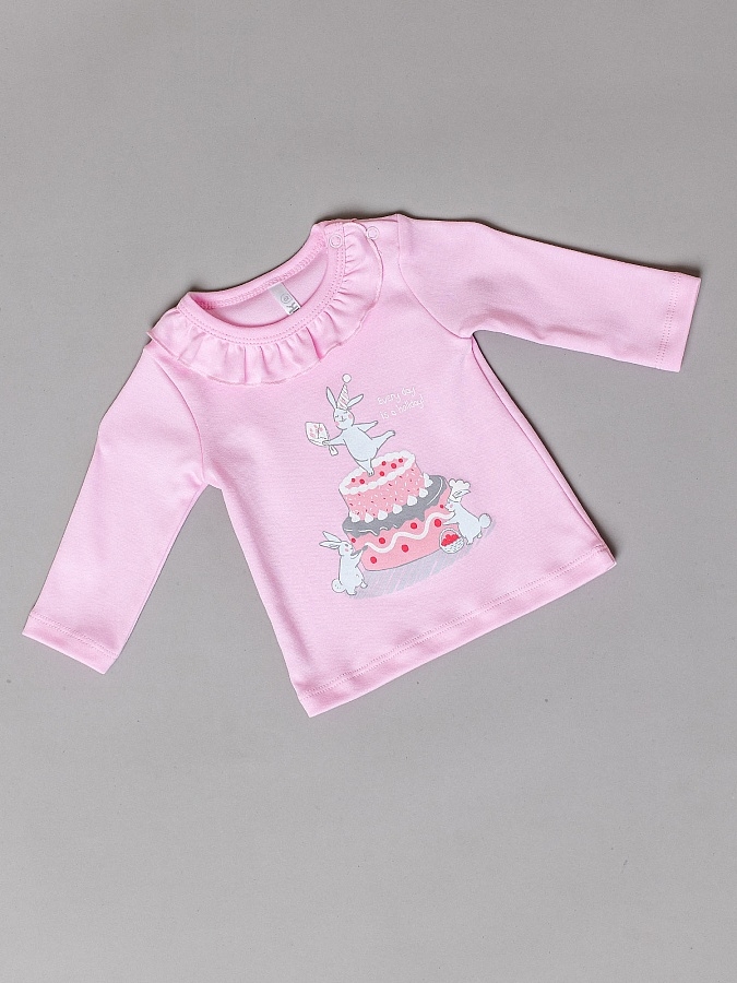 Кофточка с длинными рукавами розовая для новорожденных. Горловина на кнопке, украшена оборкой. Принт в виде зайчиков-сладкоежек. Кофточка для новорожденной девочки сшита из высококачественного трикотажа - интерлок - это 100% натуральный экологичный и гипоаллергенный хлопок.