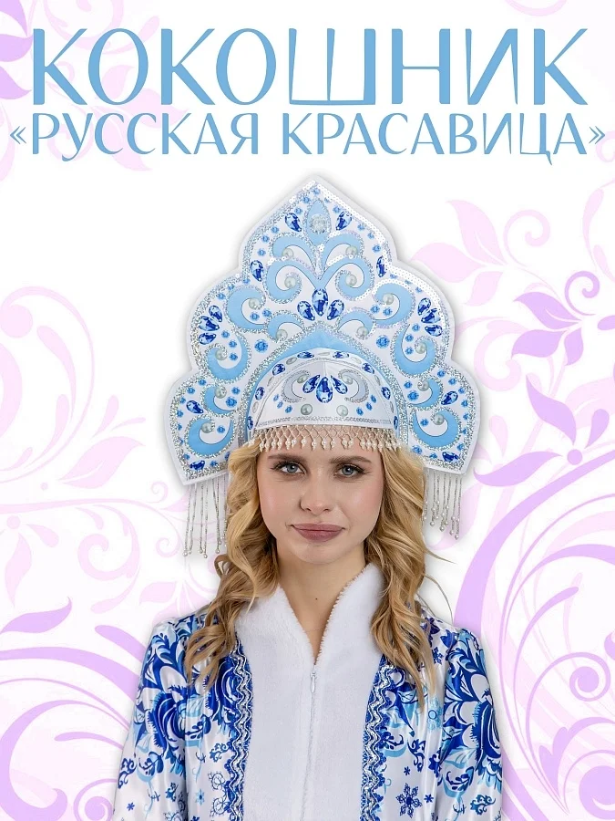 Кокошник Русская красавица бело-голубой. Красивая вышивка и орнамент с блестящими камнями. Насыщен деталями, смотрится изящно и празднично.