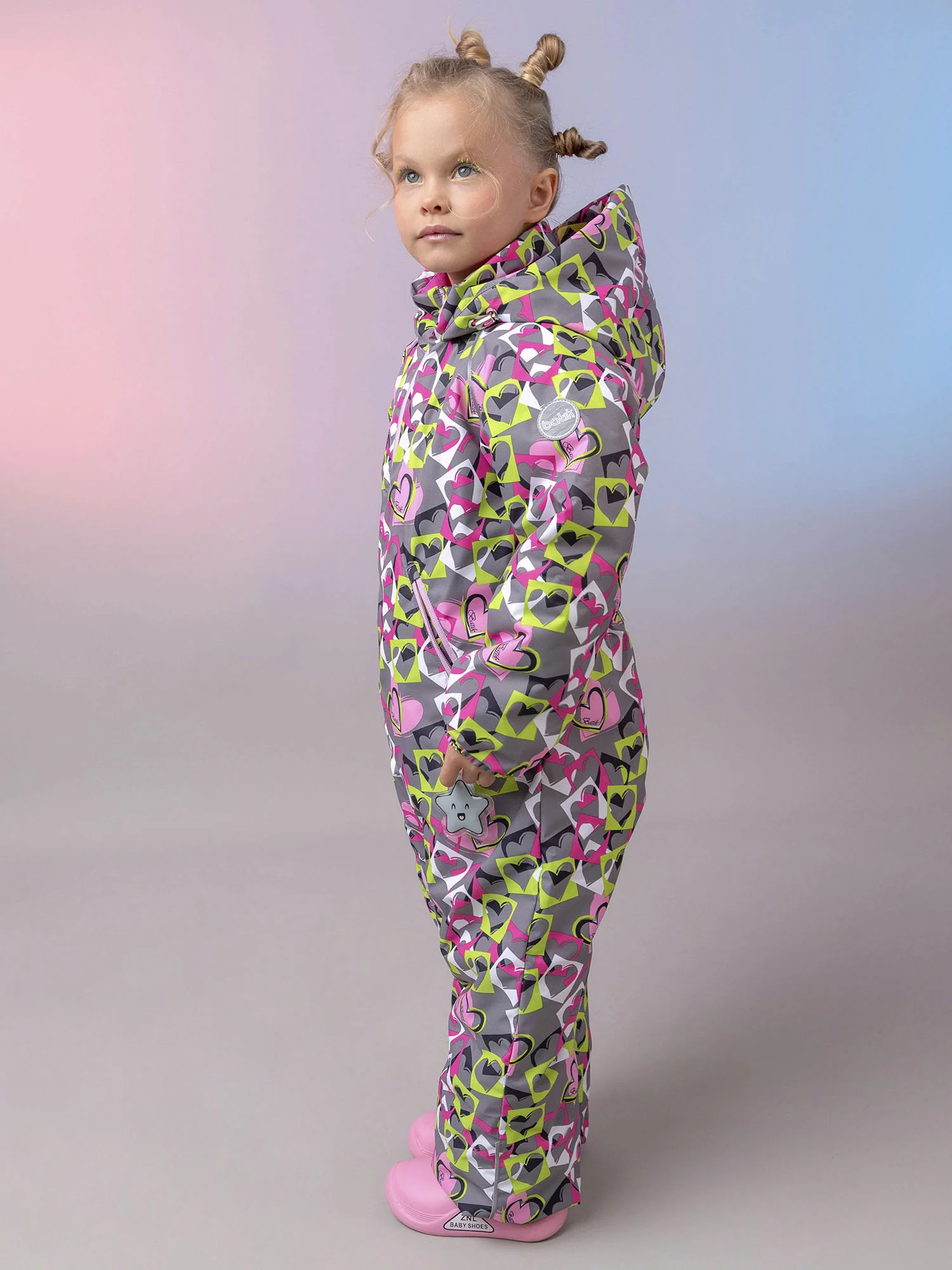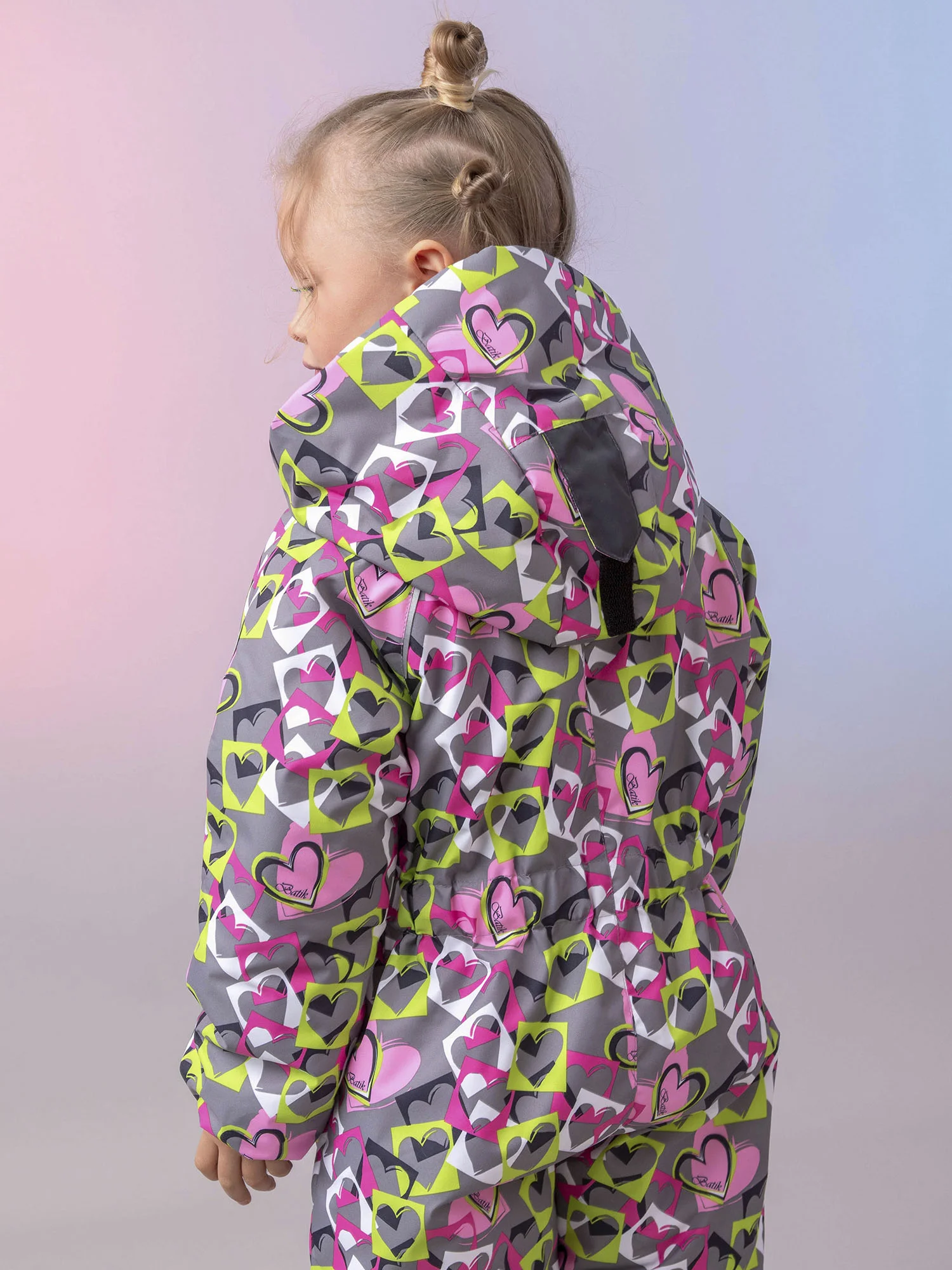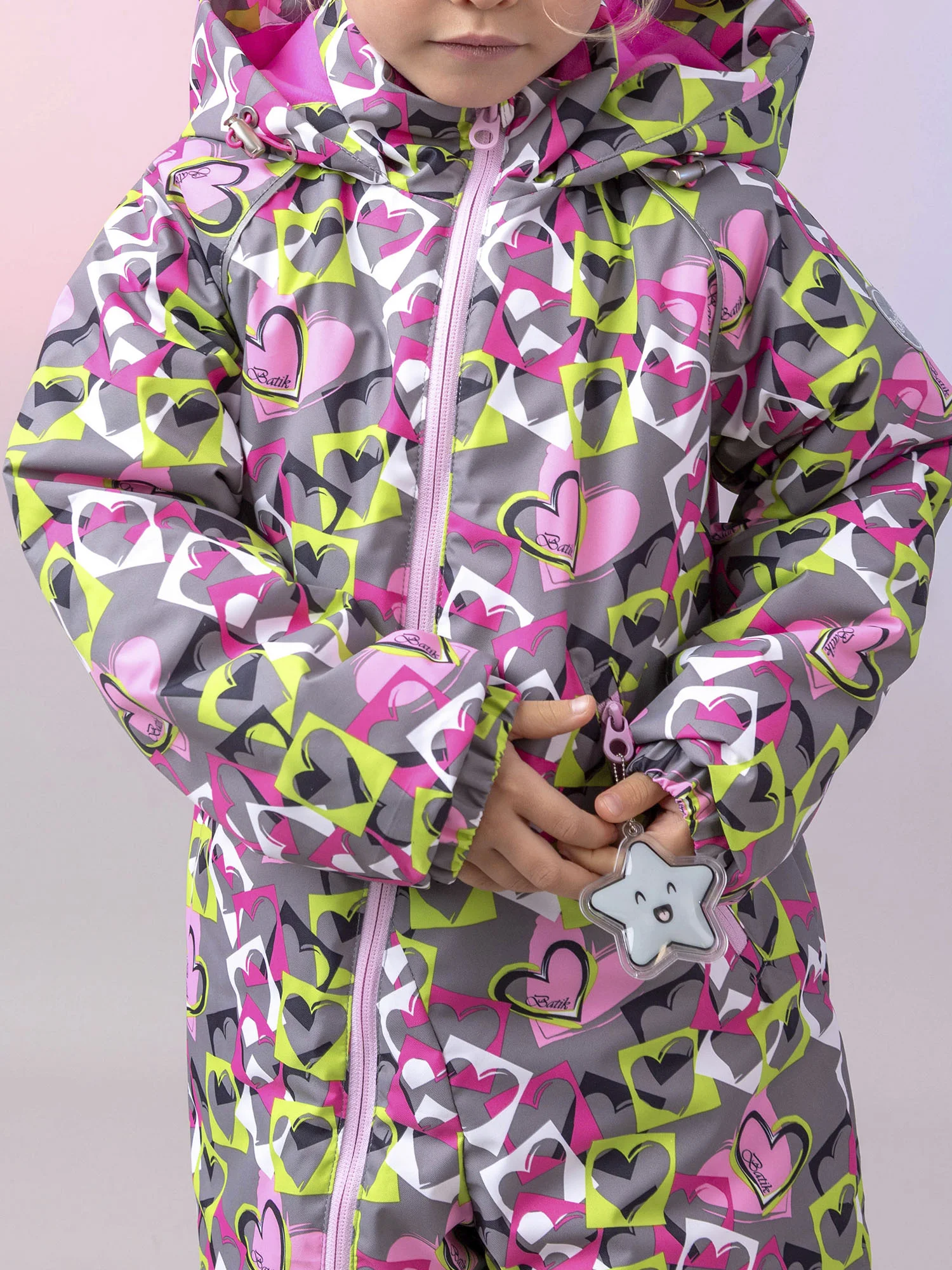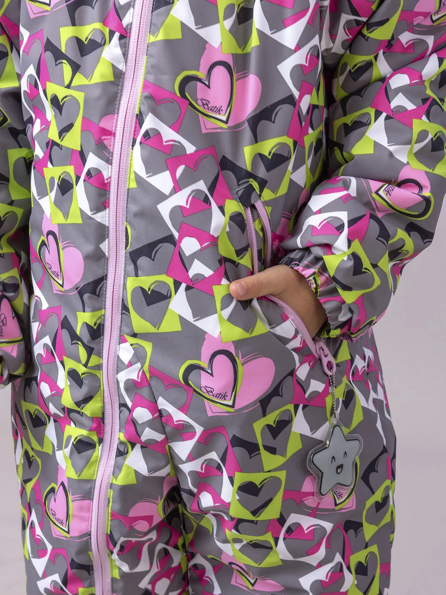 Модель оснащена карманом на молнии, манжетами на рукавах и брюках, съёмными силиконовыми штрипками и утяжкой по талии. Светоотражающие элементы — канты, нашивка и пата капюшона — повышают безопасность ребёнка в тёмное время суток.