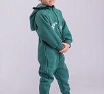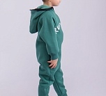 Комбинезон Джуниор зеленый детский из футера. Комбинезон с капюшоном из плотного хлопкового трикотажа. Имеет застежку-молнию по центру и эластичные манжеты рукавов и брюк. Надпись на груди.