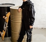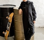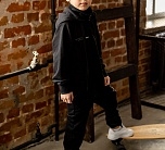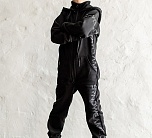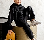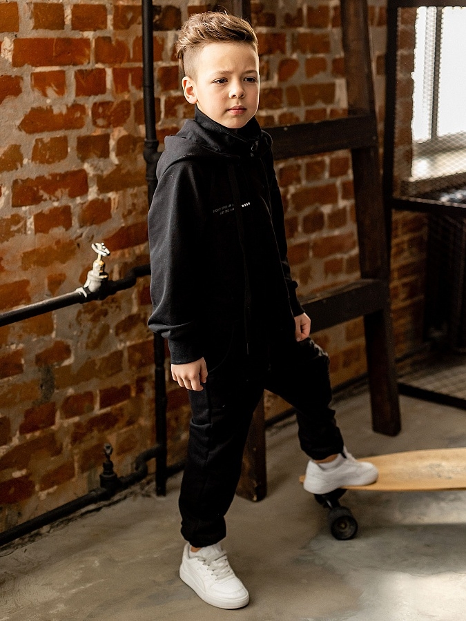 Комбинезон Элевен детский черный из футера. Комбинезон с капюшоном из плотного хлопкового трикотажа. Имеет застежку-молнию по центру и эластичные манжеты рукавов и брюк. Надписи на рукавах и брючинах. Глубокий капюшон с регулировкой объема хорошо прикрывает голову от ветра. Воротник-стойка для защиты шеи. Есть карманы.