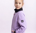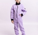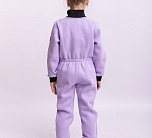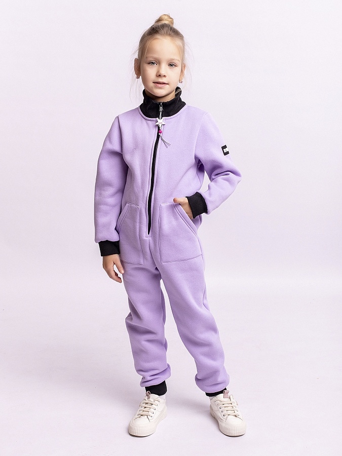 Комбинезон из футера детский Эмбер сиреневый с высоким воротником и эластичными манжетами. Застежка-молния по центру с брелоком, карманы по бокам, нашивка сбоку.