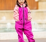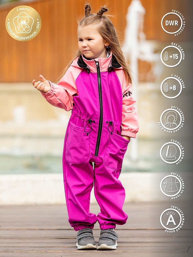 Комбинезон для девочки Либерти демисезонный из софтшелла в розово-фиалковой расцветке. Детский комбинезон без утеплителя - это настоящая находка для активных детей. Модный комбинезон из современного многослойного материала защищает ребёнка от ветра, легкого дождя и влаги, отталкивает грязь.