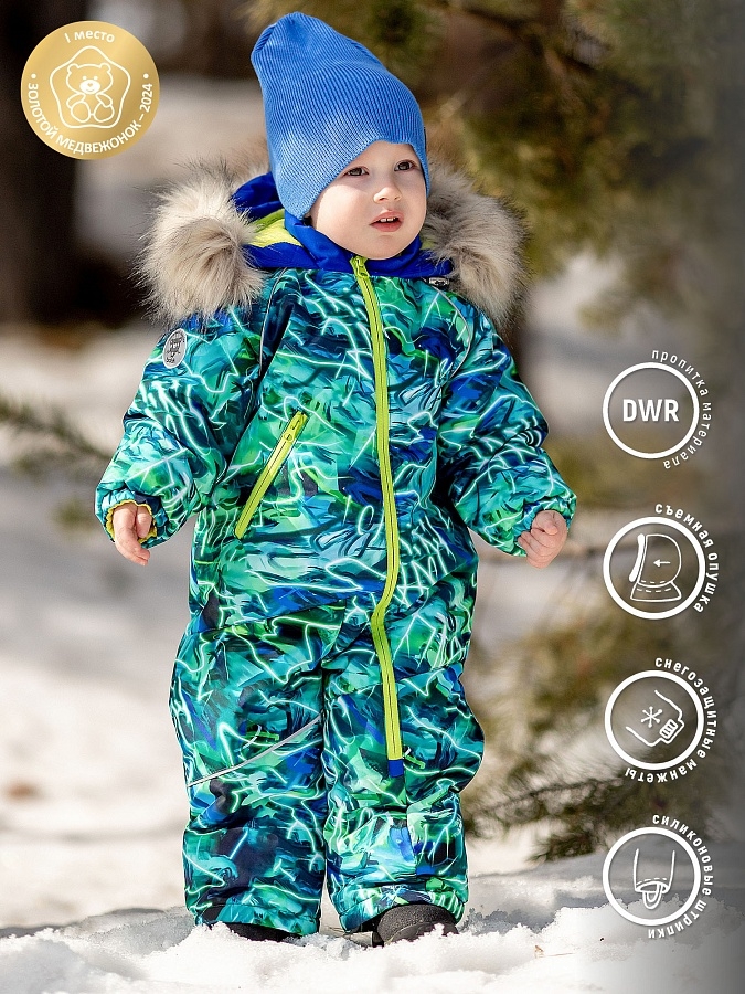 Комбинезон для мальчика Малик с ярким графичным принтом декорирован трансфером на капюшоне со светоотражающим эффектом. Съёмная искусственная опушка отлично подойдет для активных малышей, удобная центральная молния уведена в ножку, штрипки на обувь.