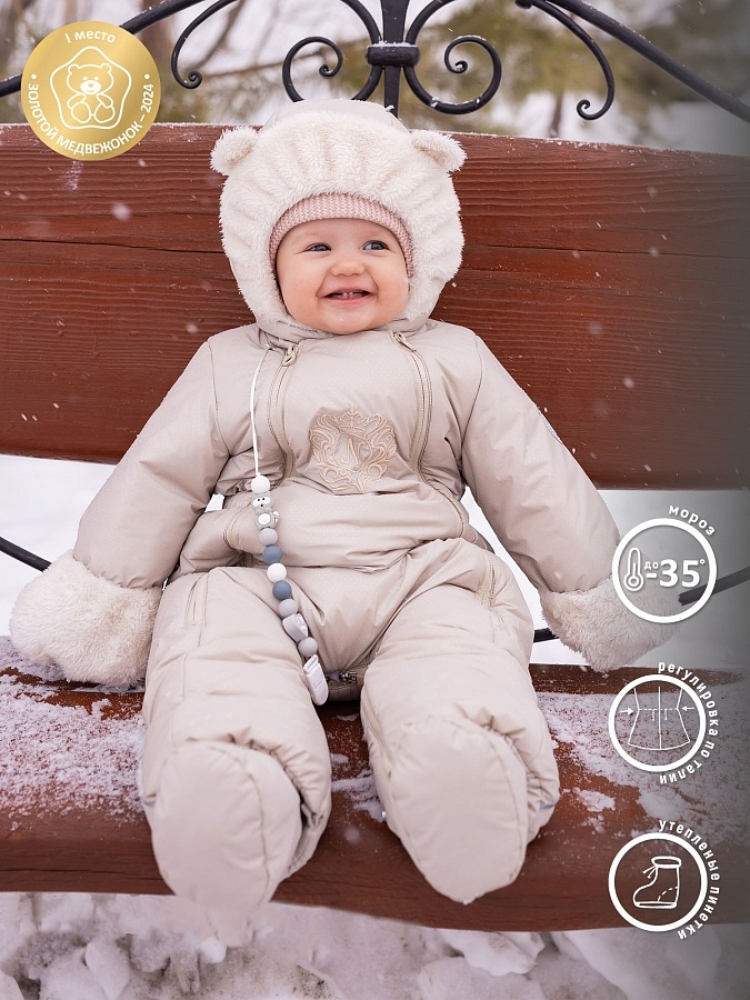 Комбинезон-трансформер бежевый для новорожденных и малышей Хоуп выполнен из курточной ткани, имеет приятные тактильные характеристики и водоотталкивающее покрытие с декором на груди. С помощью застежки на кнопках и молний комбинезон легко превращается в теплый конверт для новорожденных. Внутренняя часть капюшона, отвороты по низу ручек и ножек выполнены из мягкого гипоаллергенного меха, которые позволят защитить нежные ручки ребенка. Фронтальные молнии и молния между ножек закрыты ветрозащитными планками с изнаночной стороны, утяжка резинками в районе талии, утепленные пинетки. В качестве подарка – держатель для соски.