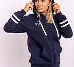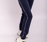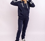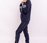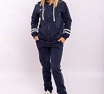 Костюм спортивный состоит из брюк и толстовки с капюшоном на полном замке средней длины, выполненный в синем цвете. Толстовка с карманами и эластичными манжетами рукавов. Брюки так же имеют карманы, резинку в поясе и в нижней части штанин.