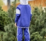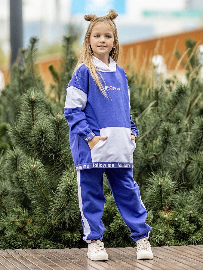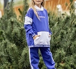 Спортивный костюм для девочки из футера бело-синий: пуловер с капюшоном и брюки на резинке.