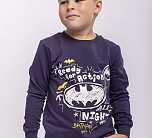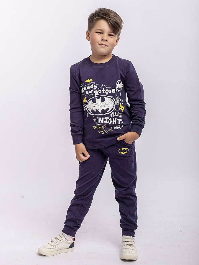 Комплект для мальчика трикотажный из футера: футболка с длинным рукавом и брюки. Синий цвет, принт на тему Бэтмена.