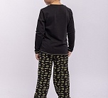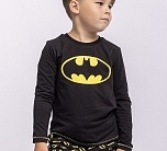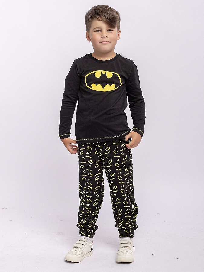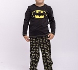Комплект для мальчика трикотажный из футера: футболка с длинным рукавом и брюки. Черный цвет, принт на тему Бэтмена.