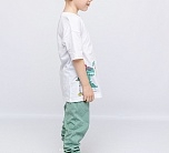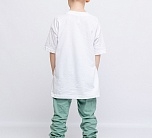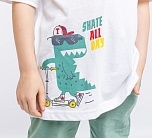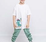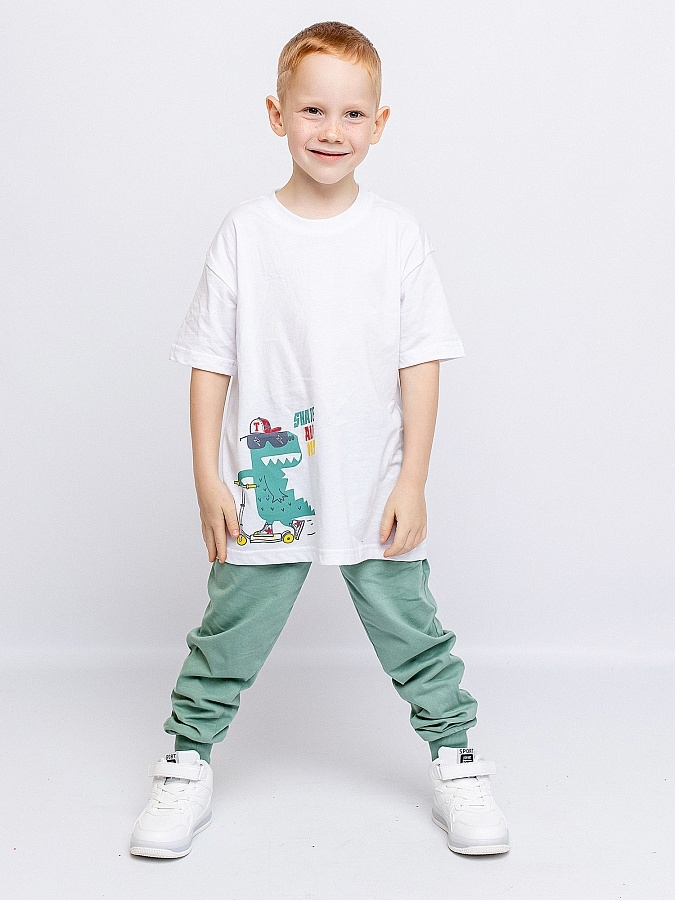 Комплект трикотажный детский: футболка с коротким рукавом и брюки. Футболка белая кроя оверсайз с динозавром. Брюки спортивные на резинке по низу. Комплект одежды для мальчика подойдет как для домашней носки, так и для улицы.