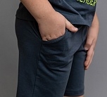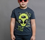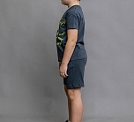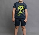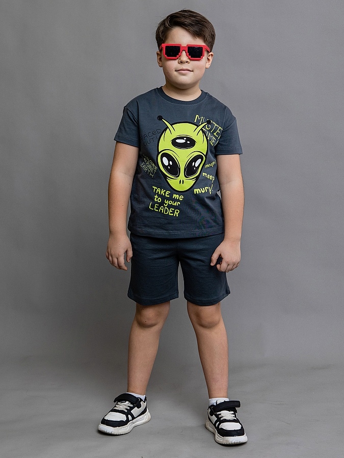 Комплект (футболка + шорты) для мальчика трикотажный из супрема пенье в цвете графит. Футболка с коротким рукавом и принтом в инопланетном стиле. Приятная на ощупь дышащая ткань комплекта не потеряет свой первоначальный вид после множества стирок.
