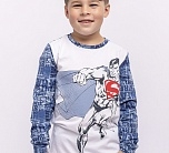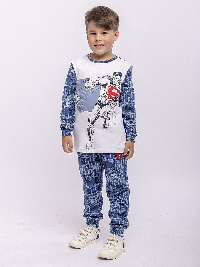 Комплект для мальчика трикотажный из футера: футболка с длинным рукавом и брюки. Бело-синий цвет, принт с Суперменом.