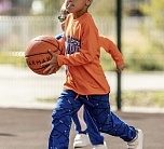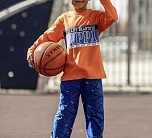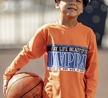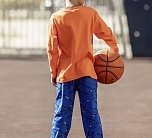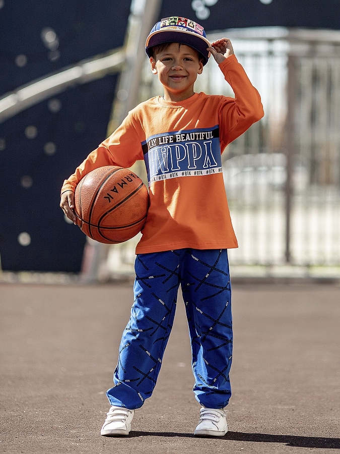 Комплект трикотажный для мальчика: оранжевый пуловер и синие брюки.