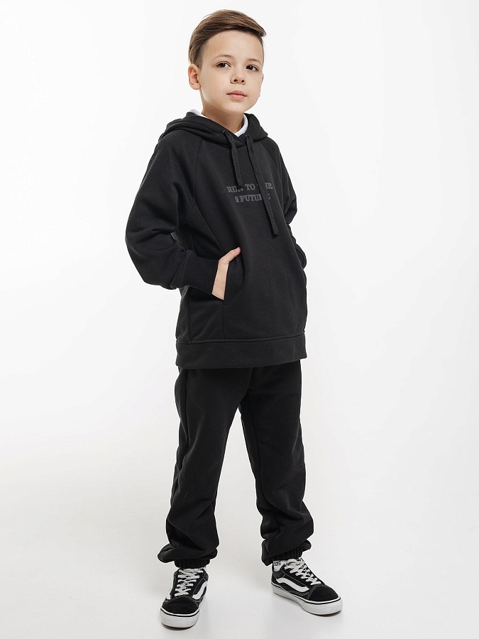 Комплект из футера Нести детский: худи и брюки черные. Худи с удобным капюшоном и надписью на груди. С эластичными манжетами и карманами. Брюки однотонные спортивные на резинке по низу. Комплект Нести подойдет для прогулок, активного отдыха и путешествий. Стильный базовый комплект для повседневной носки.