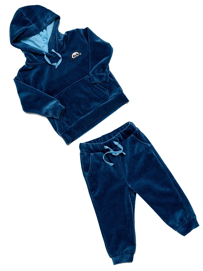 Комплект худи с капюшоном и брюки детские темно-синие. Худи с карманами и нашивкой в виде панды. Брюки на резинке с карманами по бокам.
