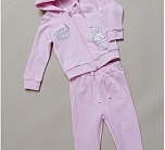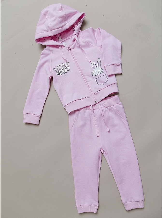 Комплект для девочки из футера розовый: толстовка и штанишки. Толстовка на молнии с капюшоном и рисунком в виде зайчика. Штанишки на резинке с боковыми карманами. Выполнен из футера 2-х нитка с начесом, приятного и гладкого на ощупь, дышащего и гипоаллергенного.