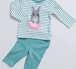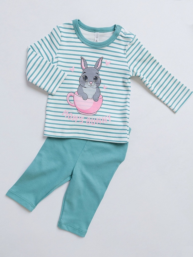 Комплект для девочки трикотажный: футболка с длинным рукавом и леггинсы. Летняя одежда из трикотажного полотна высокого качества станет незаменимой вещью для ребенка на теплую весну и лето. Костюм для девочки создан специально для новорожденных малышек от 2 месяцев до 2 лет. Футболка с принтом в полоску и милым кроликом. Леггинсы однотонные на эластичном поясе.