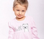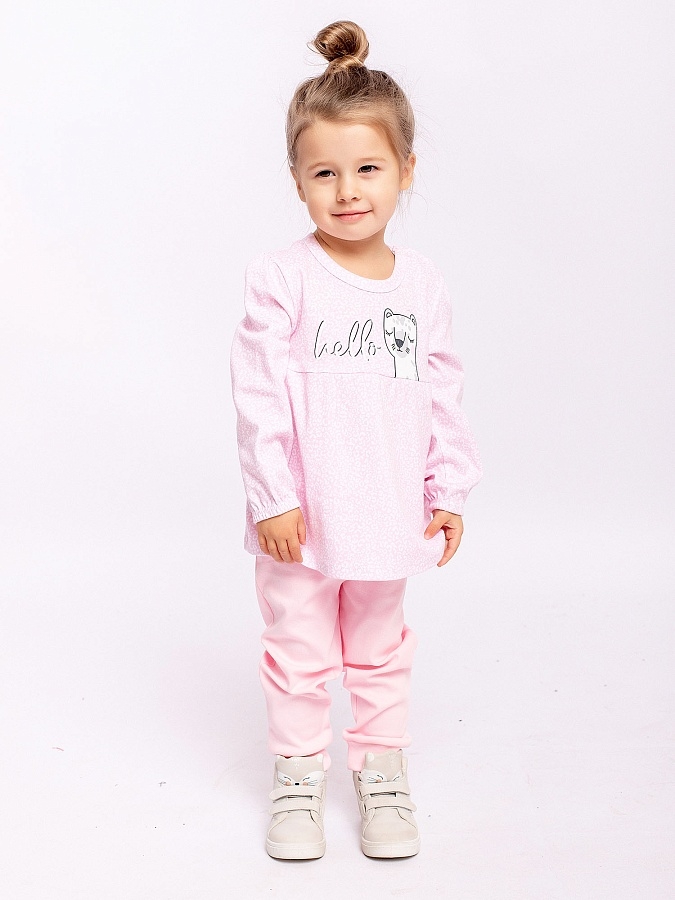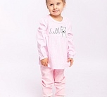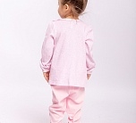 Комплект для девочки до 1,5 лет трикотажный из интерлока. Розовый комплект состоит из кофточки с длинным рукавом и штанишек. Кофточка с милым принтом и резинкой в рукавах. Штанишки однотонные.
