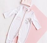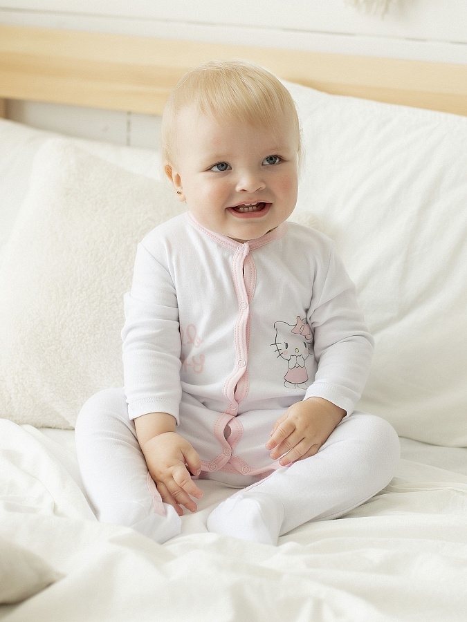 Трикотажный комплект для детей: комбинезон и шапочка. Белый цвет, принт с Хелло Китти.
