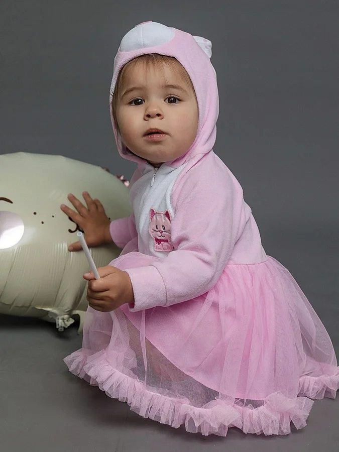 Костюм Кошечки для девочек до 1 годика - милый образ, который подойдет на фотосессию или первое костюмированное торжество малыша. Чудесный новогодний костюм Кошечка для самых маленьких выполнен из хлопковой ткани. Костюм представлен в виде комбинезона-боди с капюшоном и юбочкой.