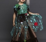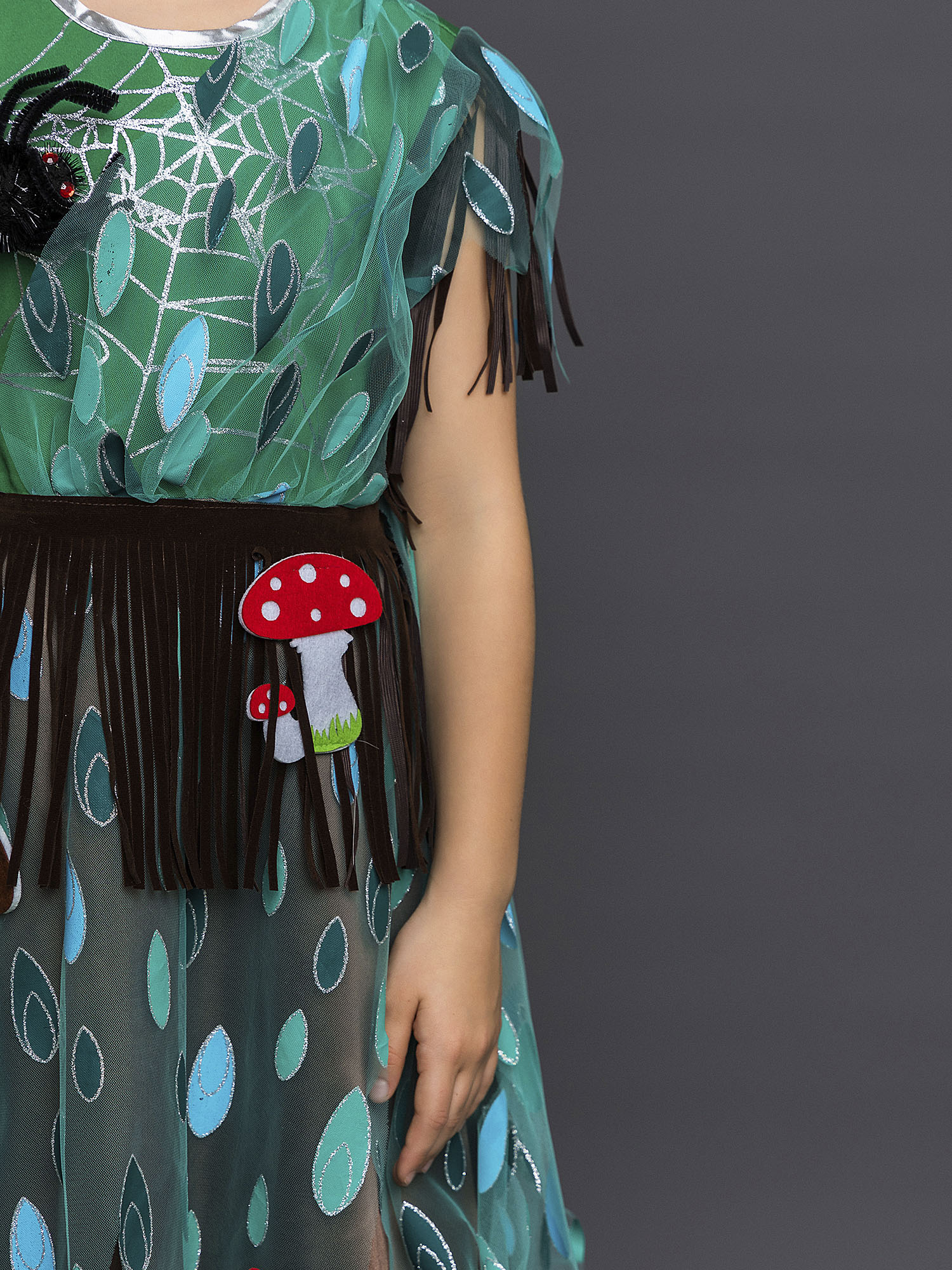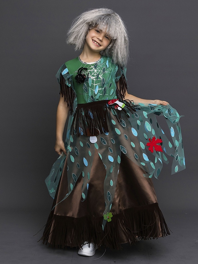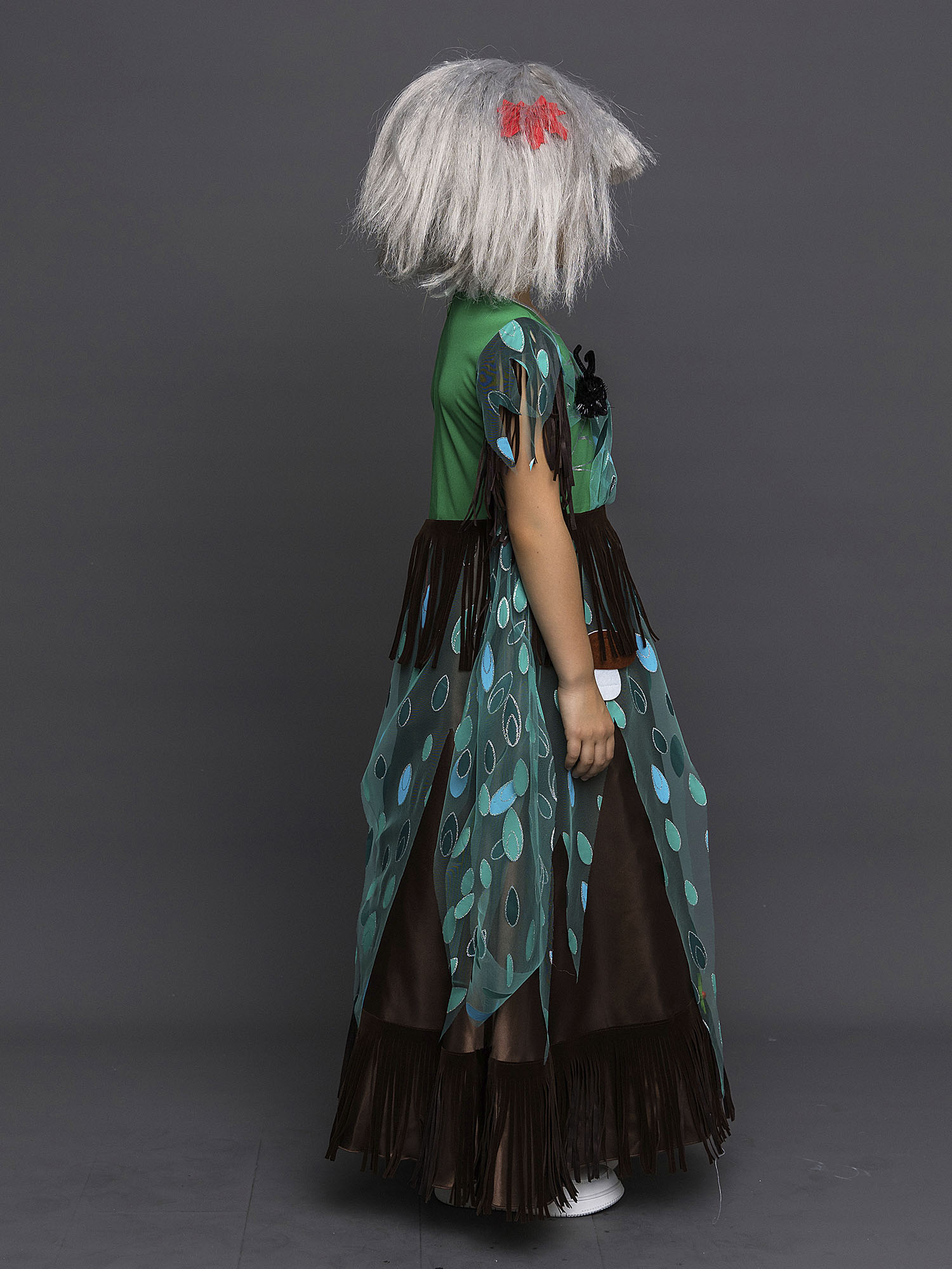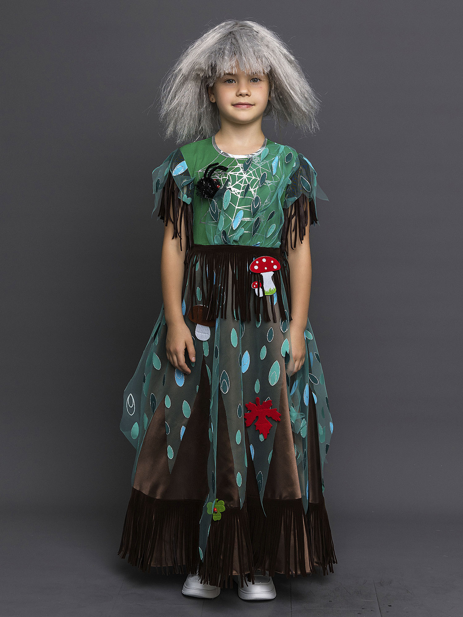 Карнавальный костюм Кикиморы детский на 4-9 лет. В комплекте платье с подъюбником и парик. Нашивки из фетра в виде листьев, принт с блестками на сетке, тесьма бахрома по низу платья, термотрансфер в виде паутины на груди, игрушка паучок.