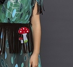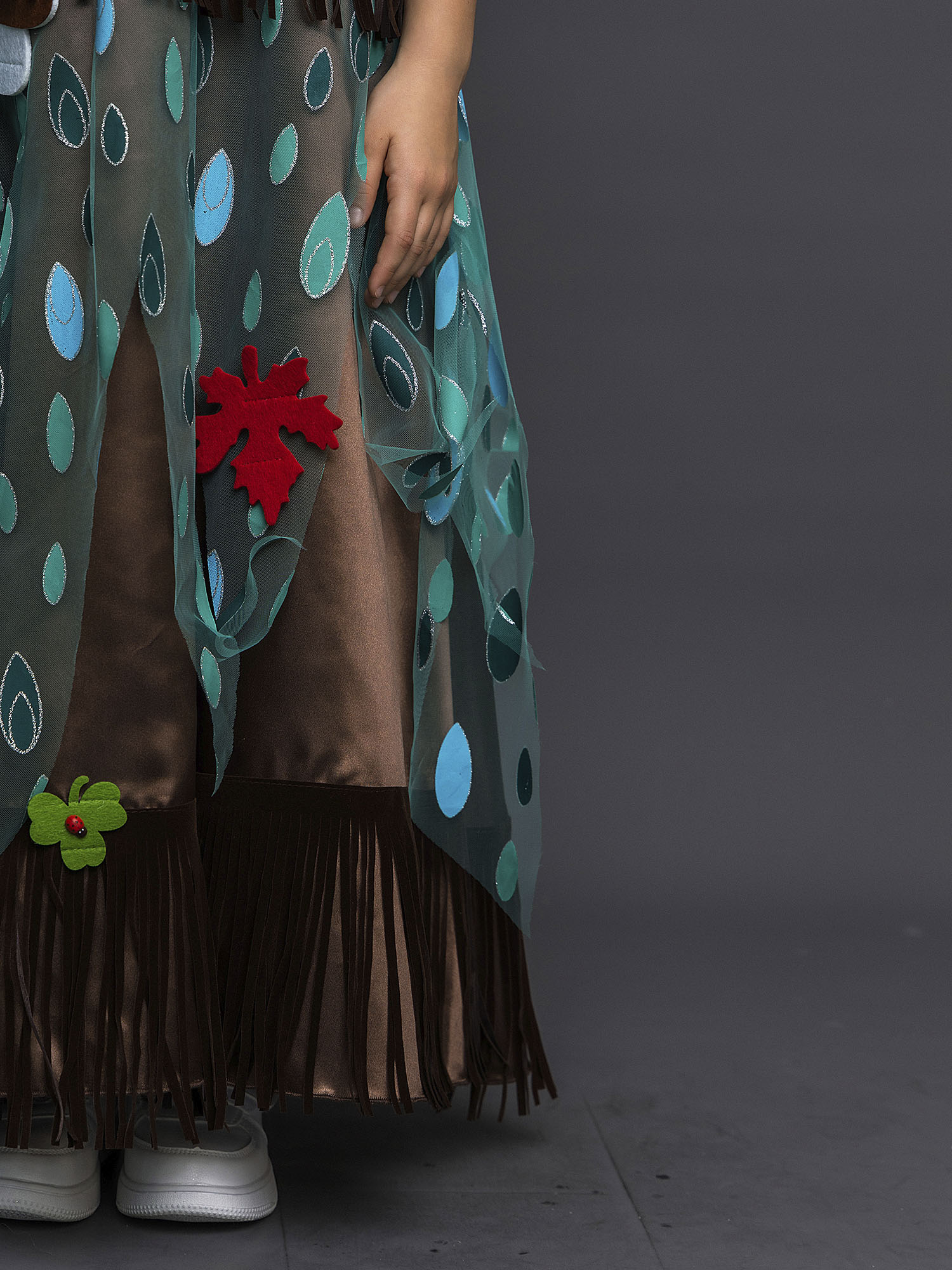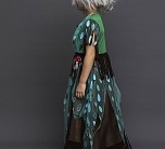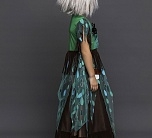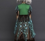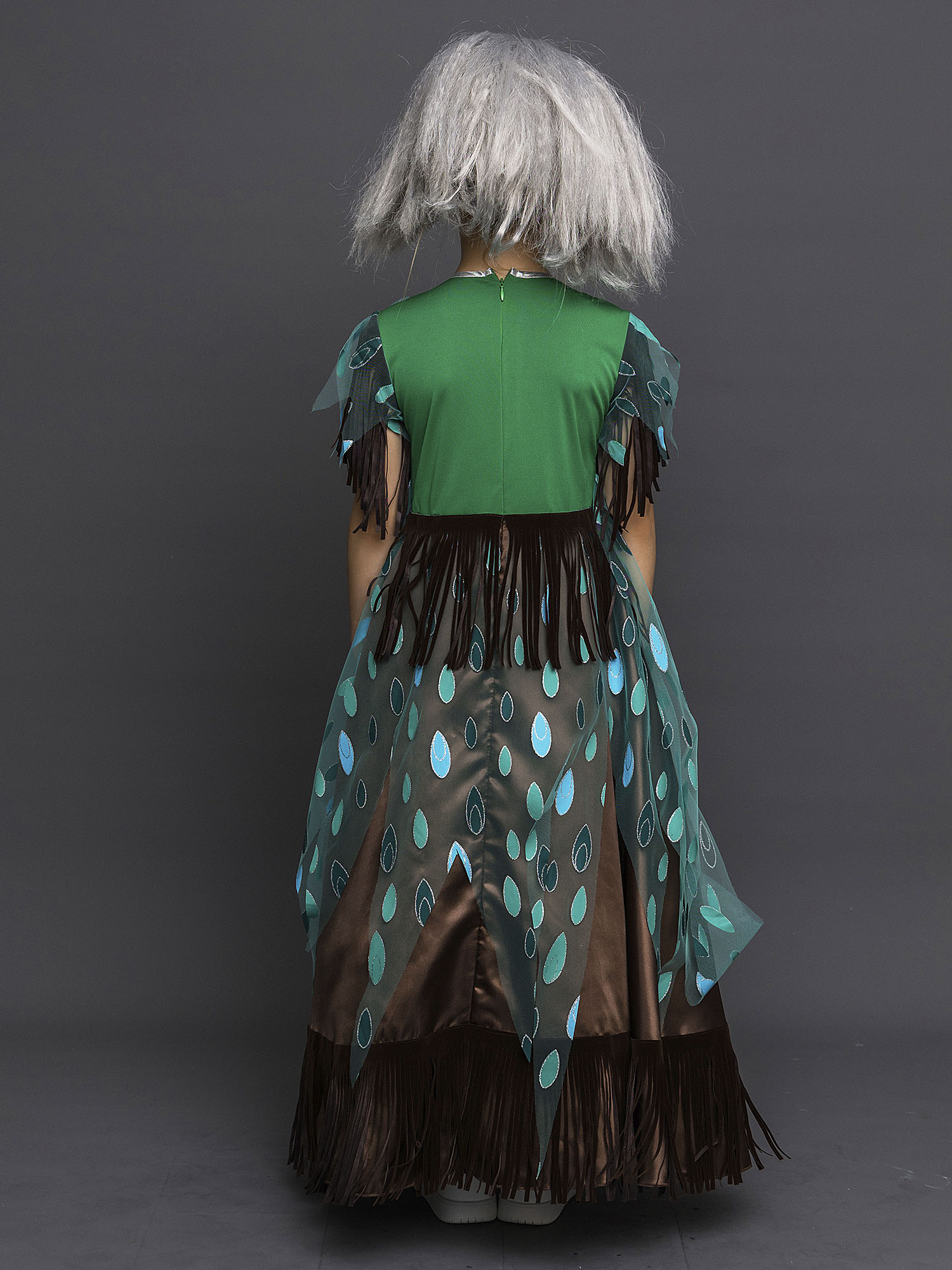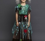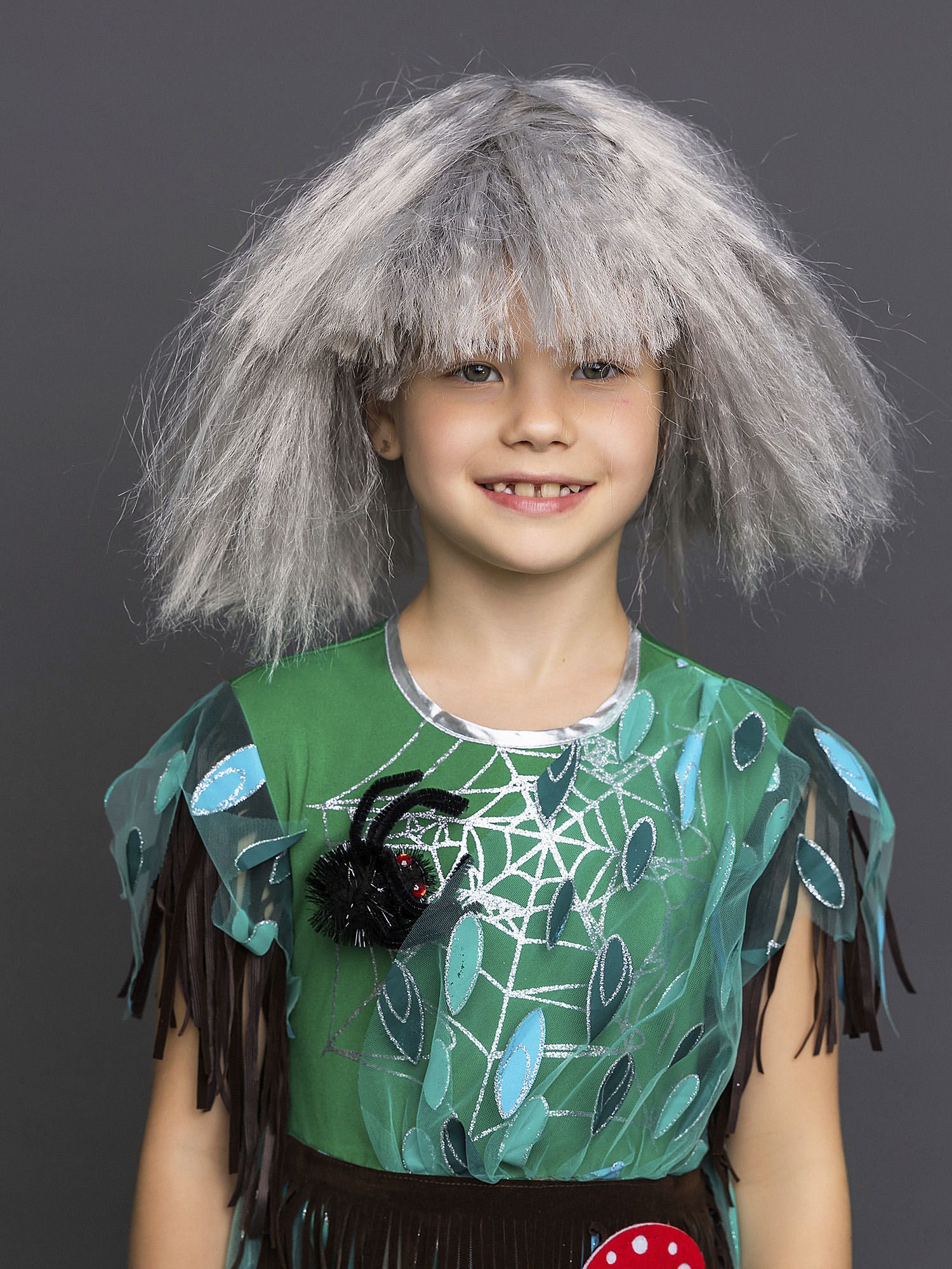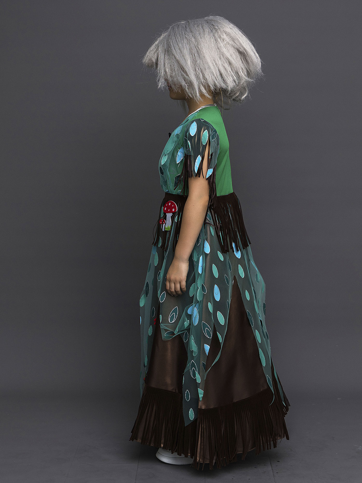 Карнавальный костюм Кикиморы детский на 4-9 лет. В комплекте платье с подъюбником и парик. Нашивки из фетра в виде листьев, принт с блестками на сетке, тесьма бахрома по низу платья, термотрансфер в виде паутины на груди, игрушка паучок.